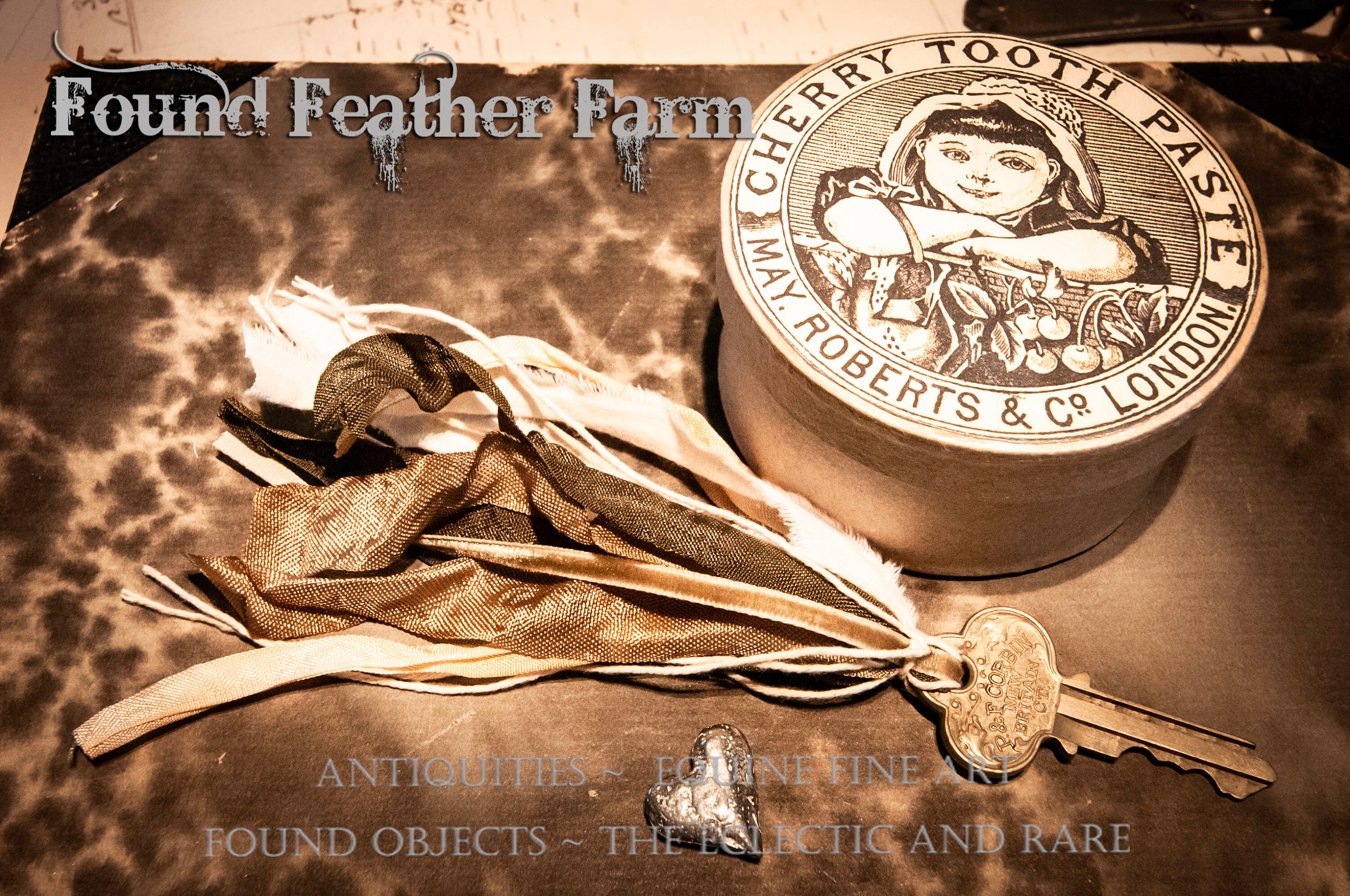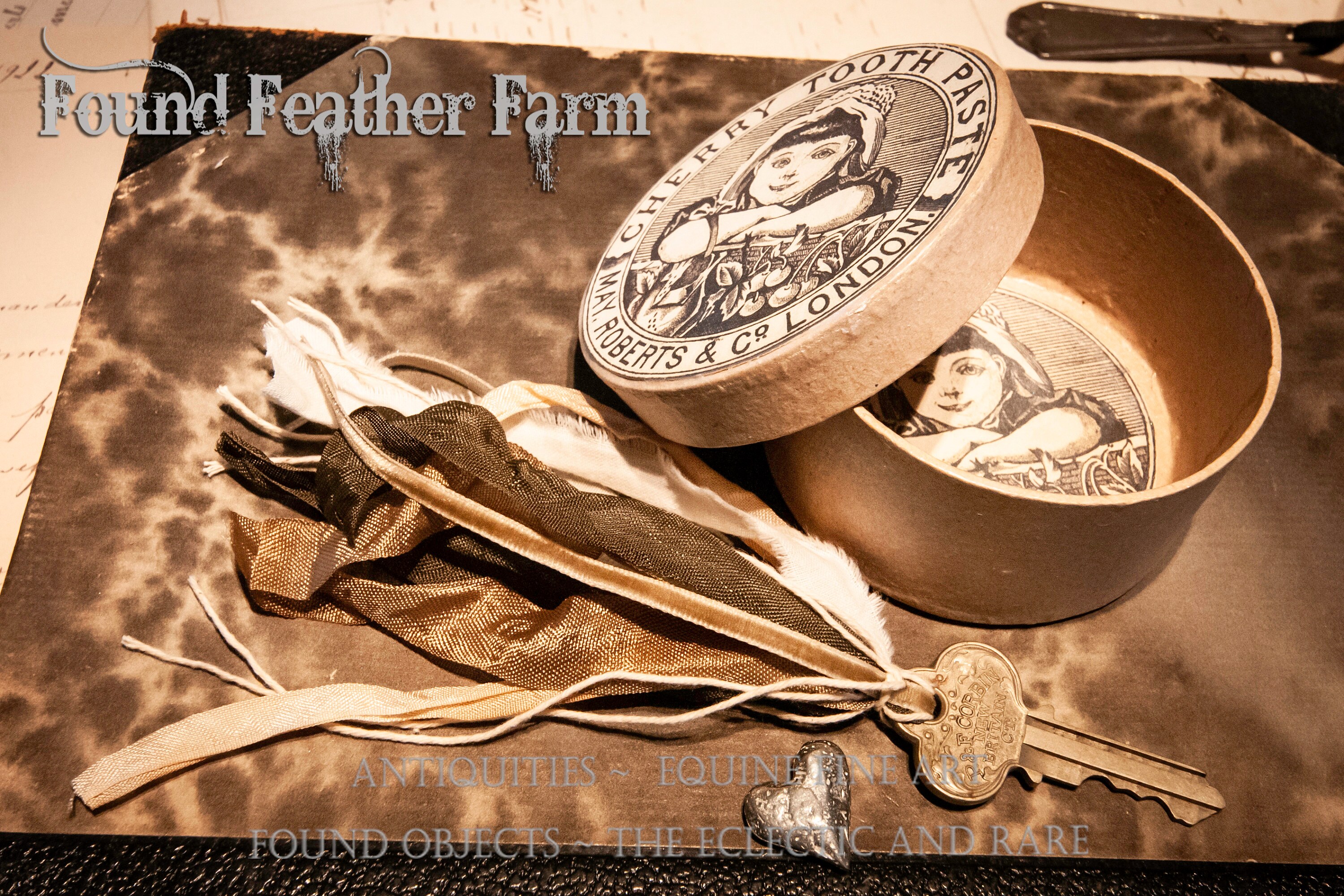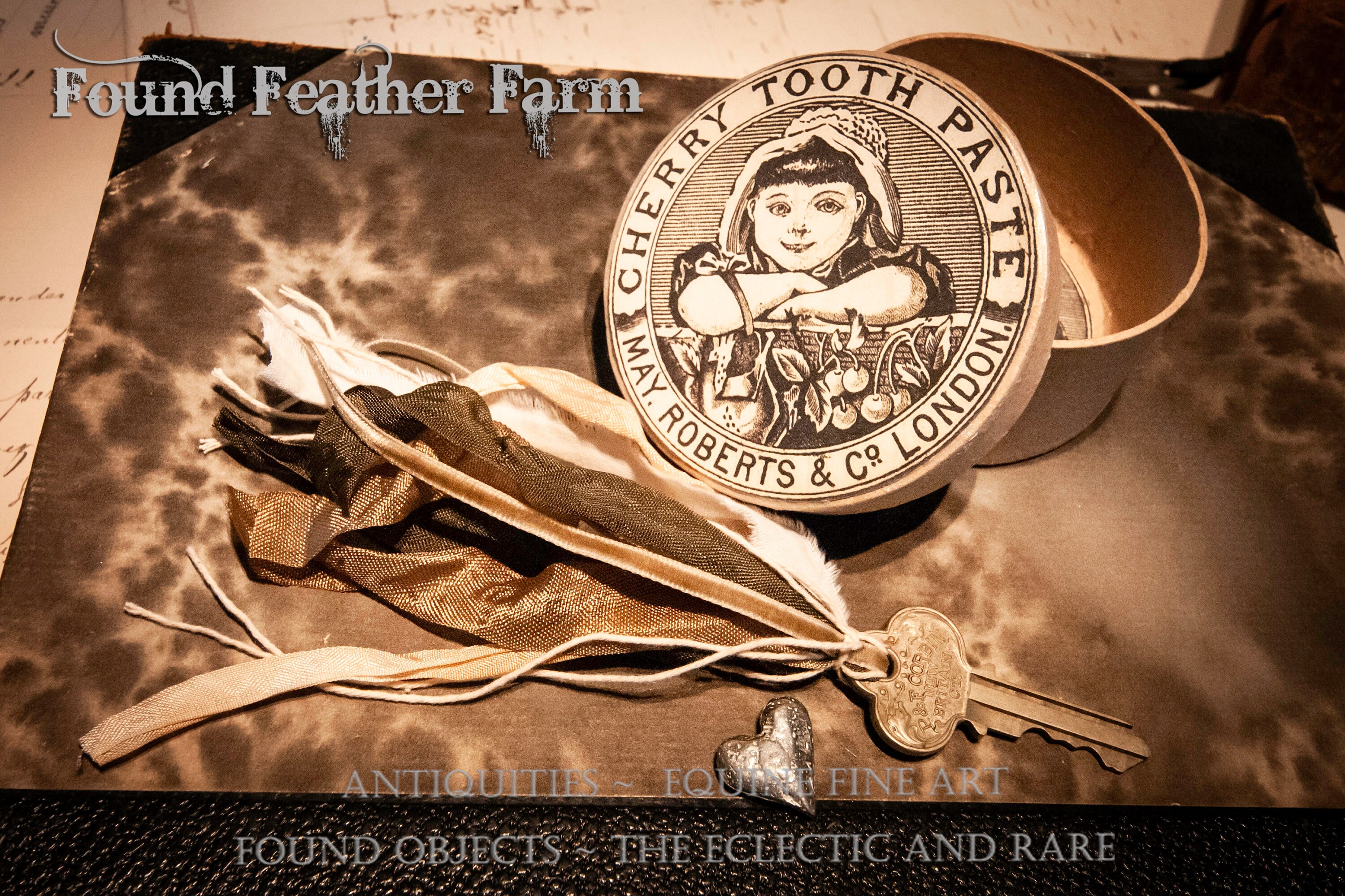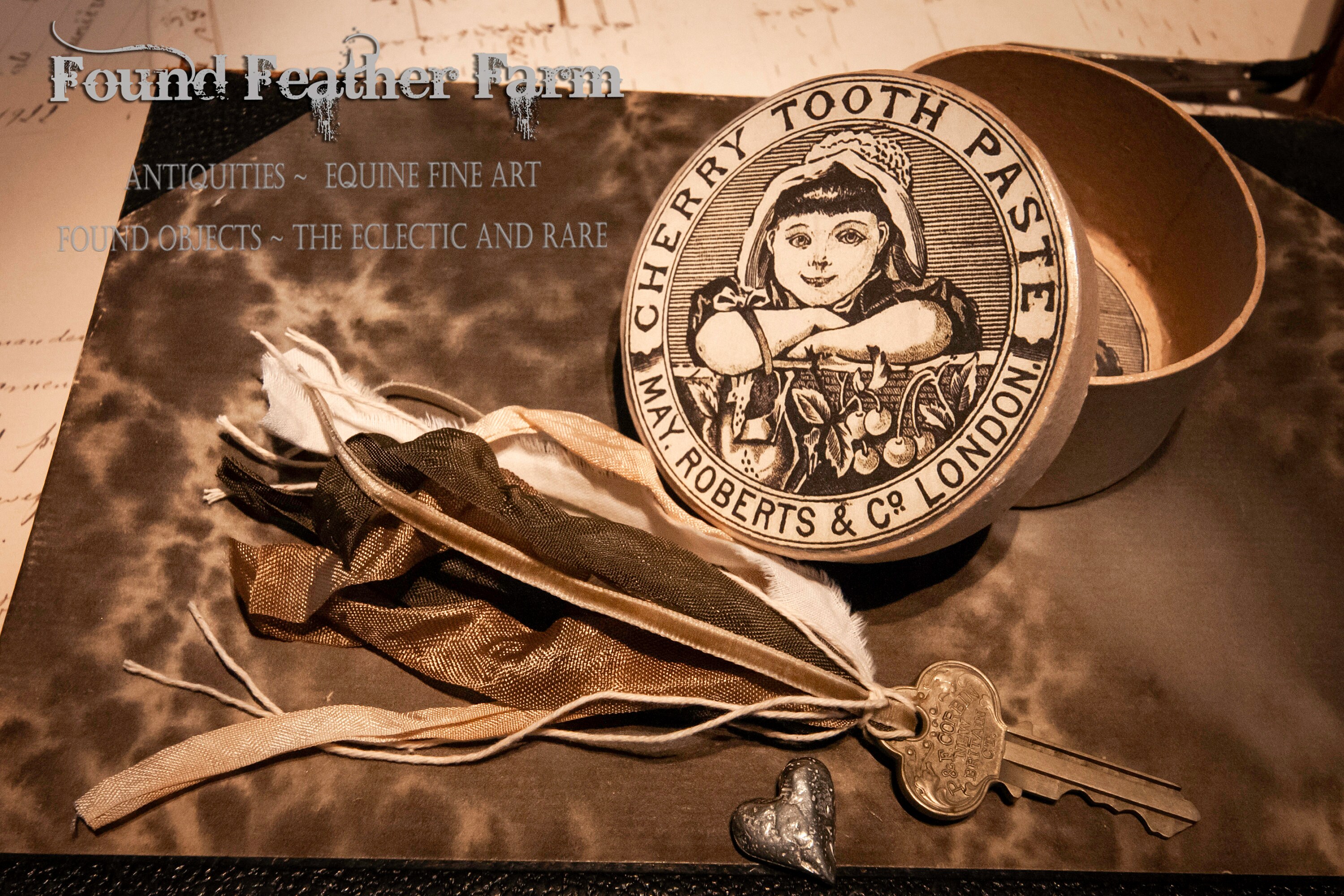 Our wonderful new series of handmade paper mache cache boxes with printed antique labels or images. This is a small natural Kraft paper box hand washed with a beautiful transparent silver wax and embellished with the printed antique image of a British Ephemera Cherry Tooth Paste Label by May Roberts & Co. out of London.