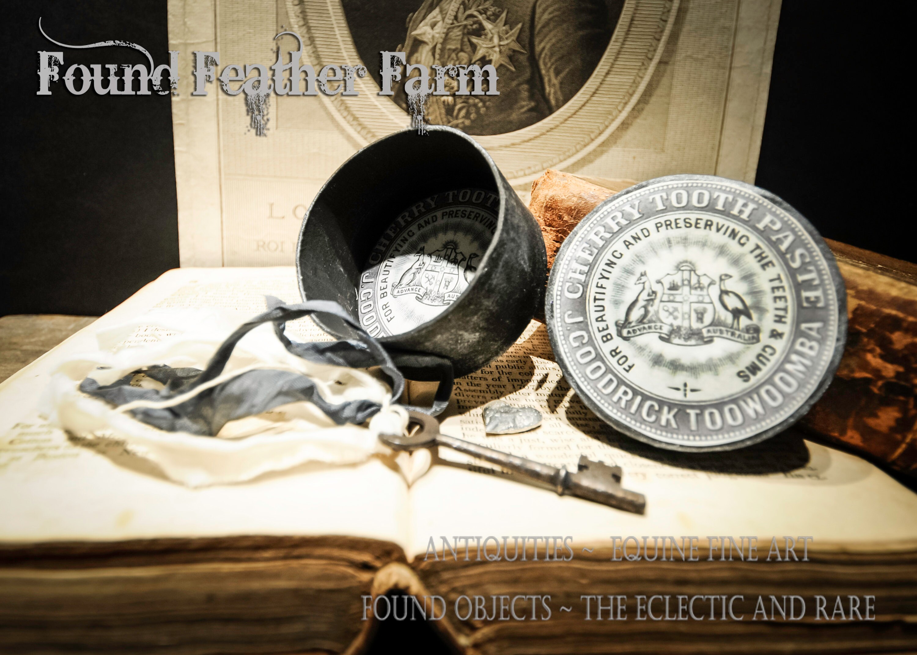 Our wonderful new series of handmade paper mache cache boxes with printed reproduction antique labels or images. This is a small chalk painted black Kraft paper box hand washed with a beautiful transparent silver wax and embellished with the antique reproduction advertising image of a J. Goodrick Toowoomba Cherry Tooth Paste label from London, England.