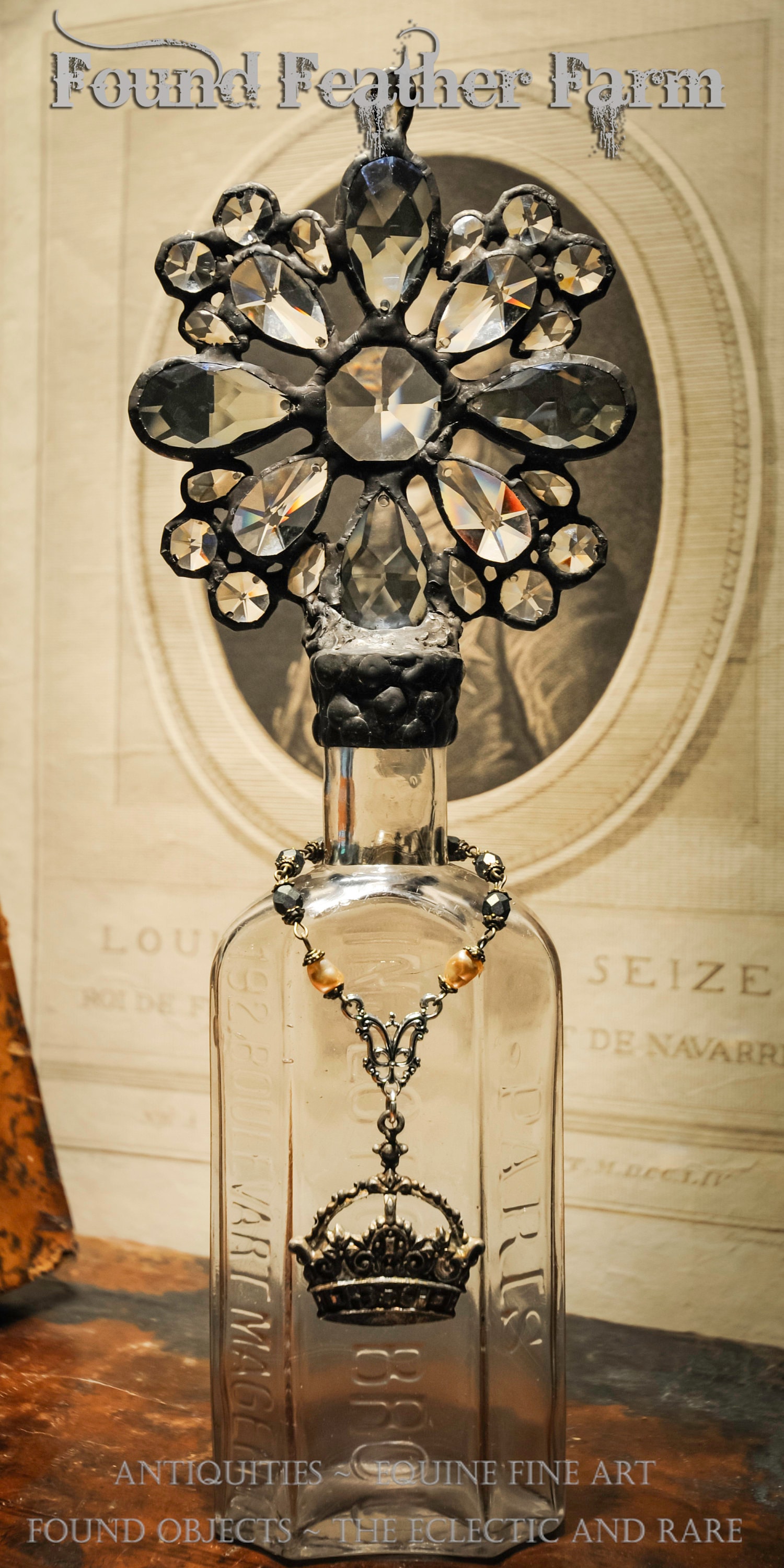 Each bottle is articulated with a unique artistic interpretation and the crystals have been fastened with a layering of heavy old world solder that is then hand washed with a time worn rich patina of blackened pewter and weathered iron. Many of our Cross Bottles are dressed and adorned with collected Czech rosary chain and crystals beads, seashells, jewels, and seed pearls that have been saved and collected for many years. Other bottles are further embellished with sterling silver treasures and pewter wax seals, jeweled hearts and crosses. Careful attention is given to the selection of all of the impeccable details.