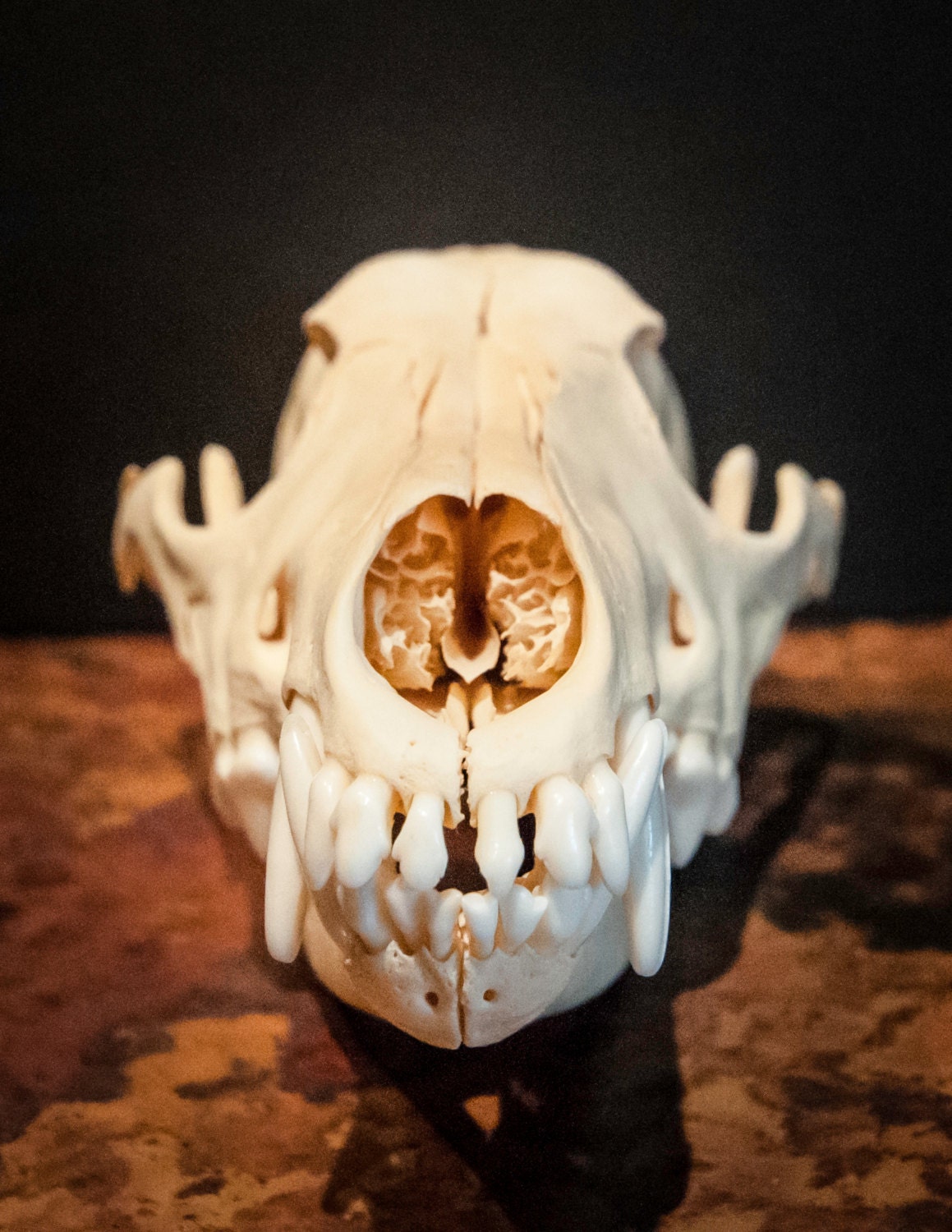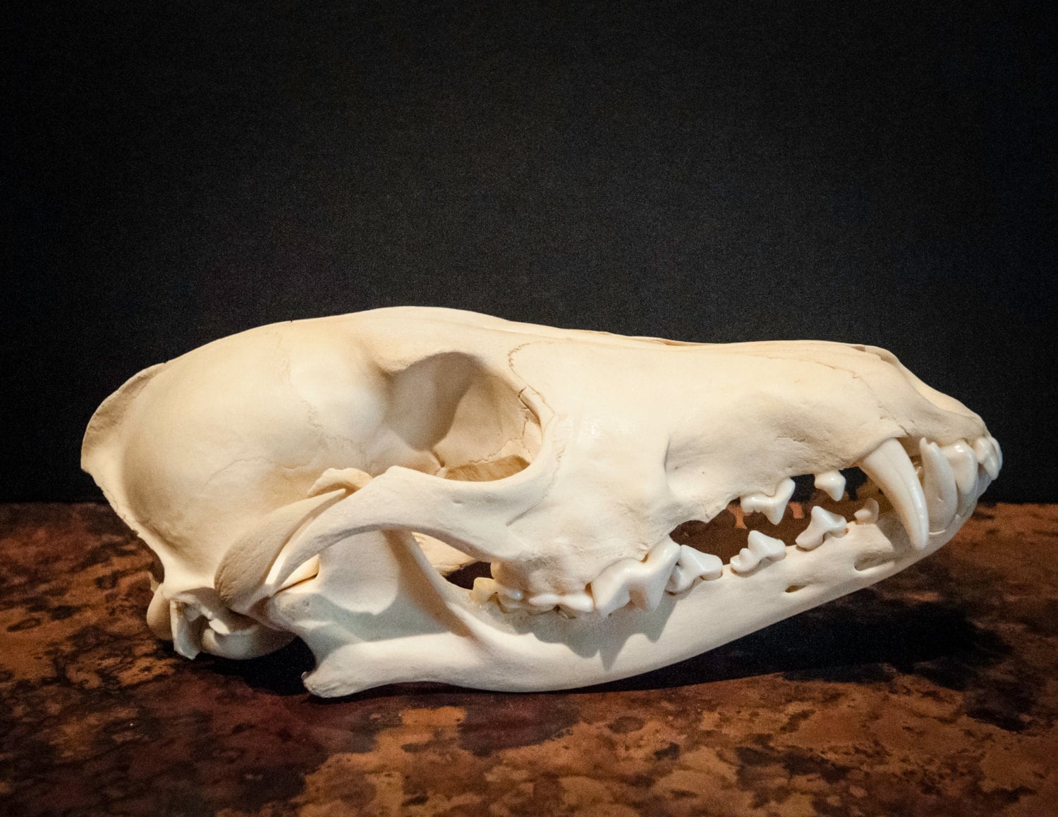 The various types of teeth in this coyote skull are evidence of its varied omnivorous diet.