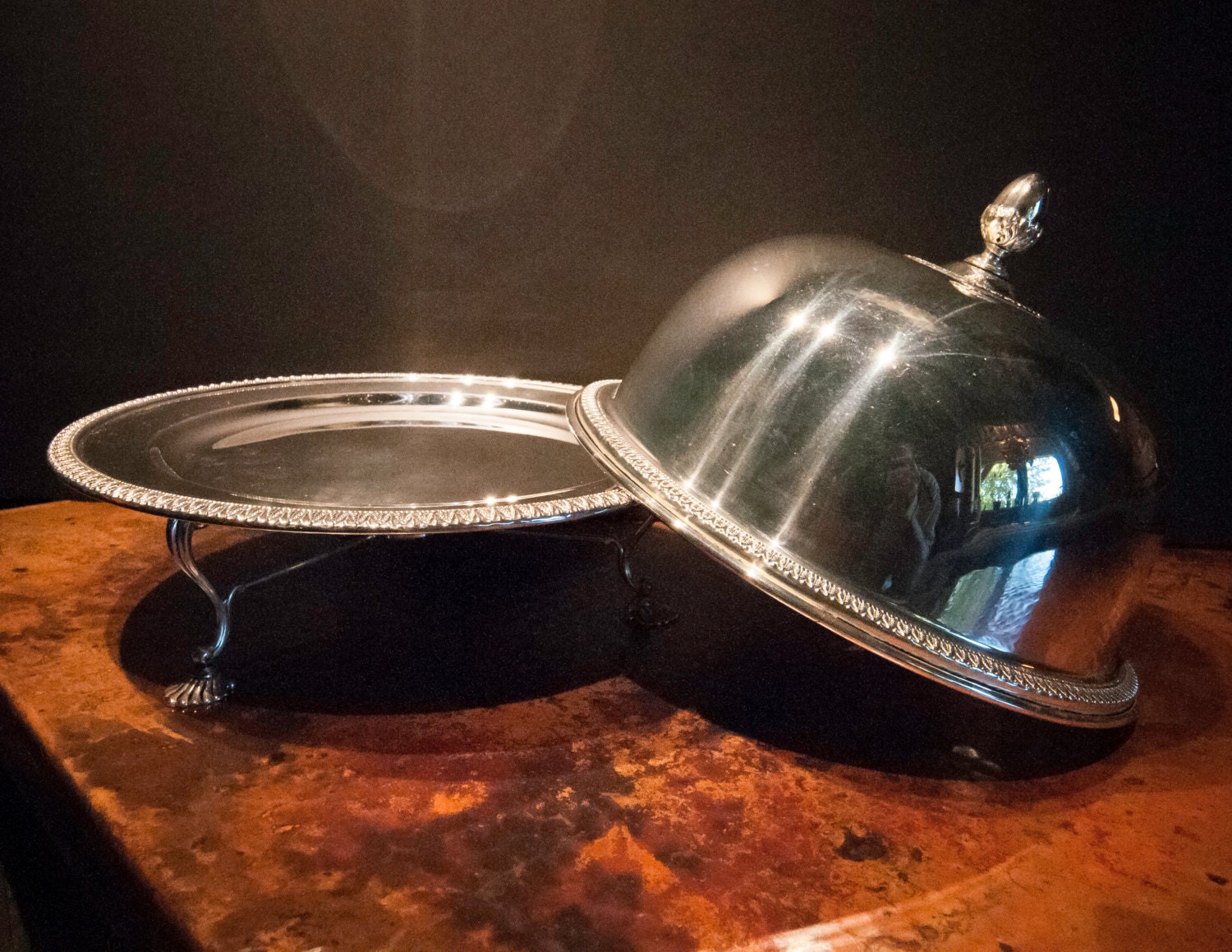 This is a beautiful Silver plated serving plate with a matching stand and also a silver plate domed cover.