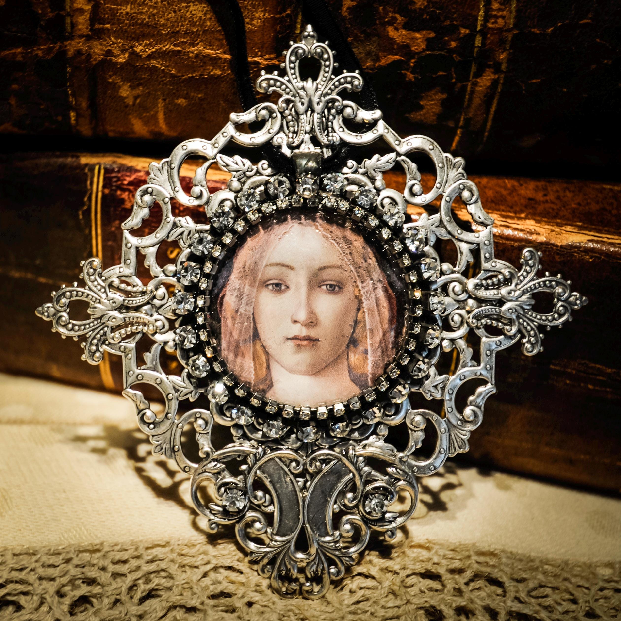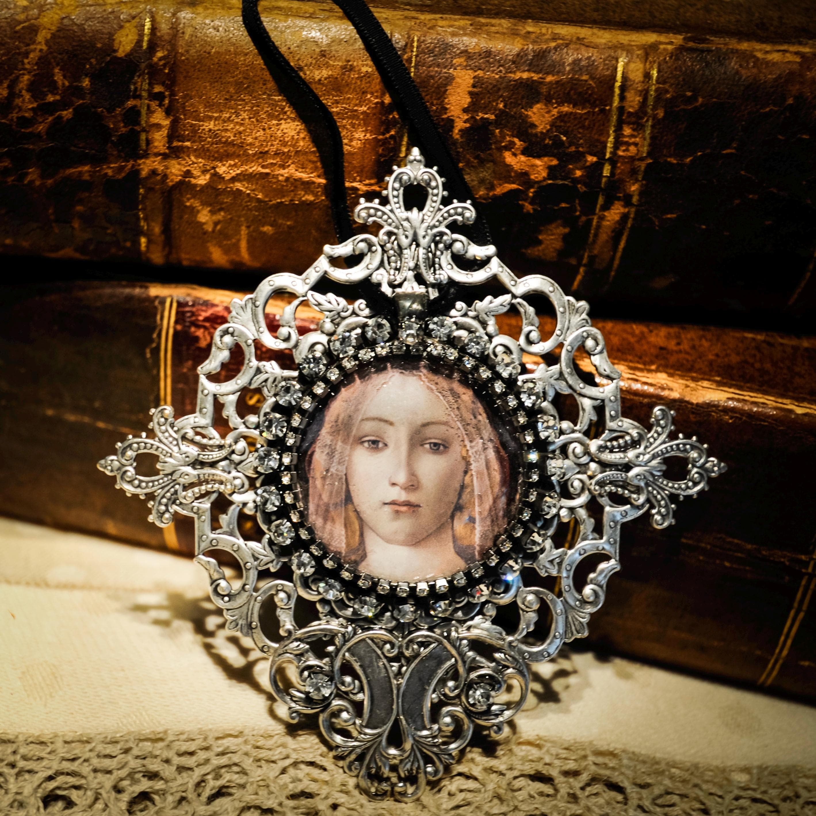 A gorgeous handmade large magnet or ornament featuring an embellished glass cabochon with a beautiful printed vintage image of a Botticelli renaissance painting of a woman. Great attention has been paid to both details and to materials combined together for an amazing bit of rich creativity. The glass cabochon has been set into a gorgeous silver detailed round stamping that has been circled by a clear rhinestone cup chains and with a beautiful silver flourishes.