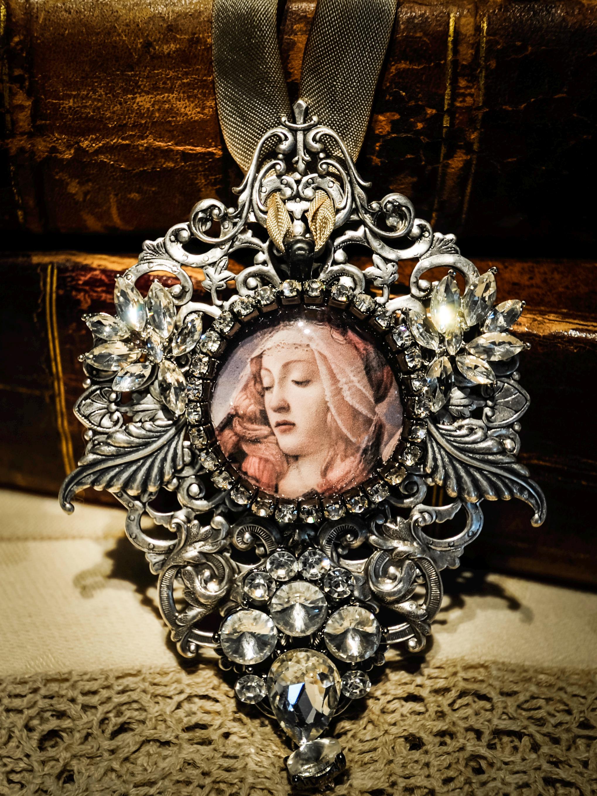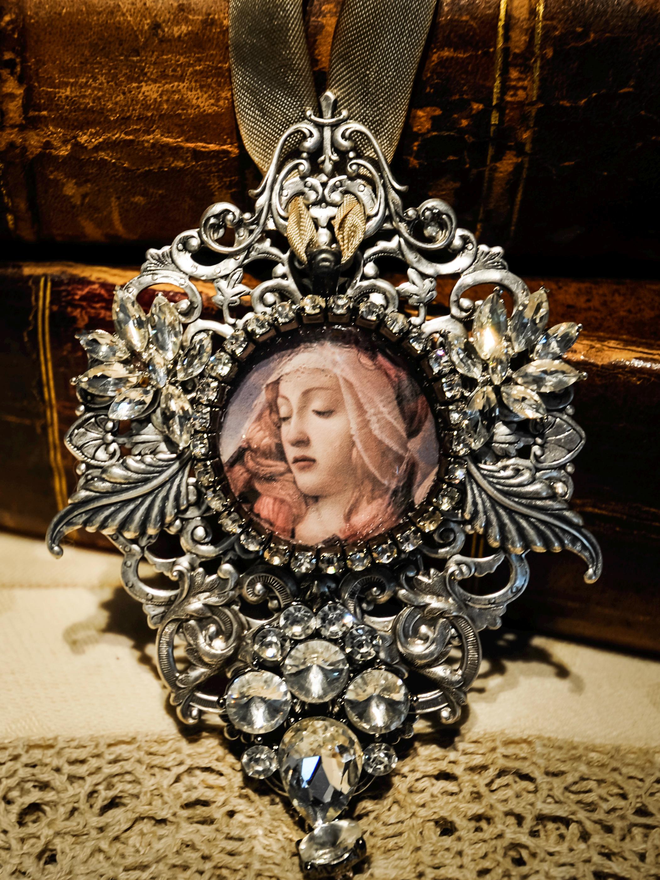 A gorgeous handmade large magnet or ornament featuring an embellished glass cabochon with a beautiful printed vintage image of a renaissance painting of a woman. Great attention has been paid to both details and to materials combined together for an amazing bit of rich creativity. The clear glass cabochon has been set into a gorgeous silver detailed round stamping that has been flanked by ornate silver leaf stampings, a clear rhinestone cup chain and has been topped with a beautiful silver and rhinestone flourishes. A large featured detail sits at the base and has a beautiful rhinestone free hanging drop detail.
