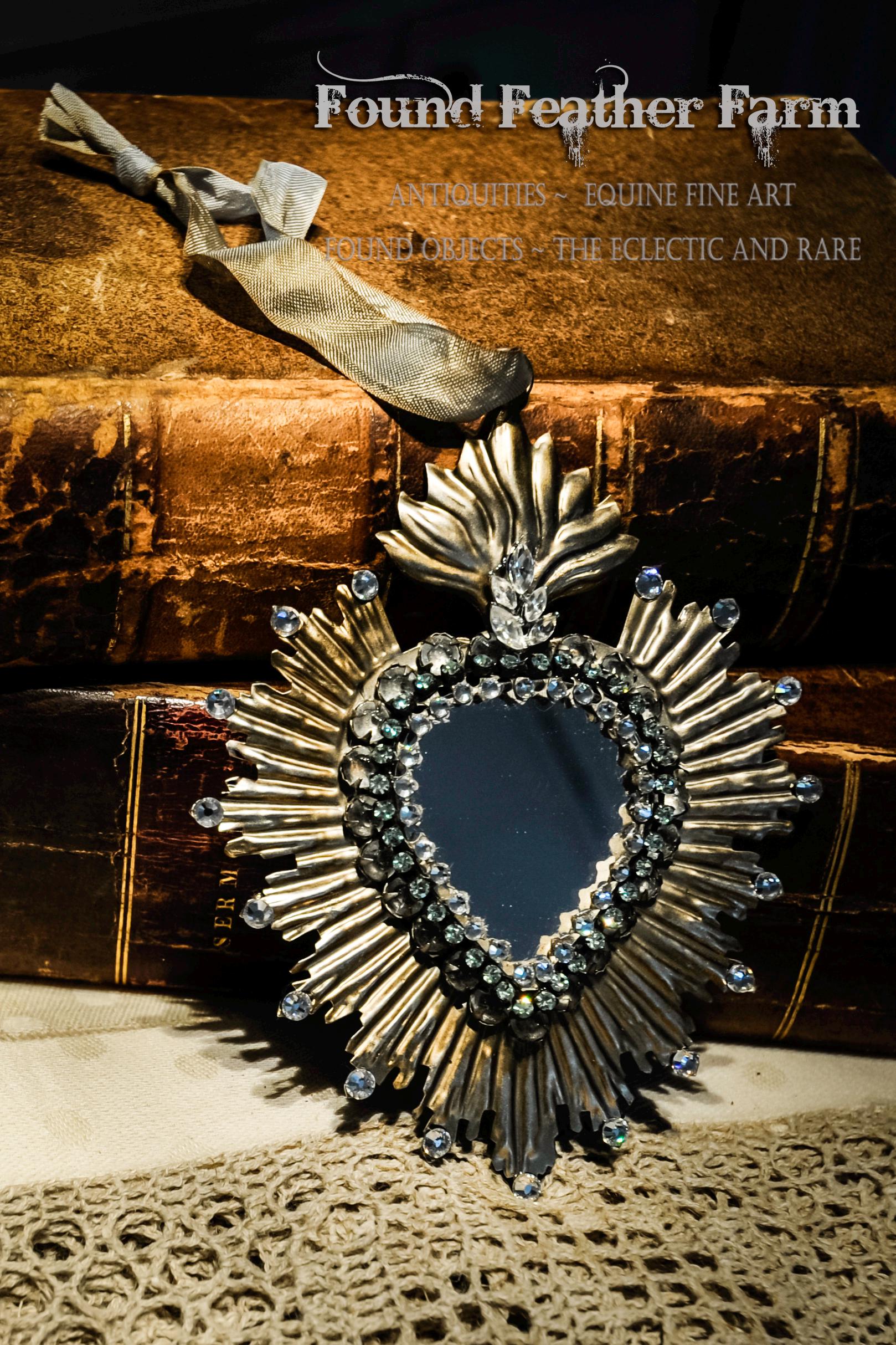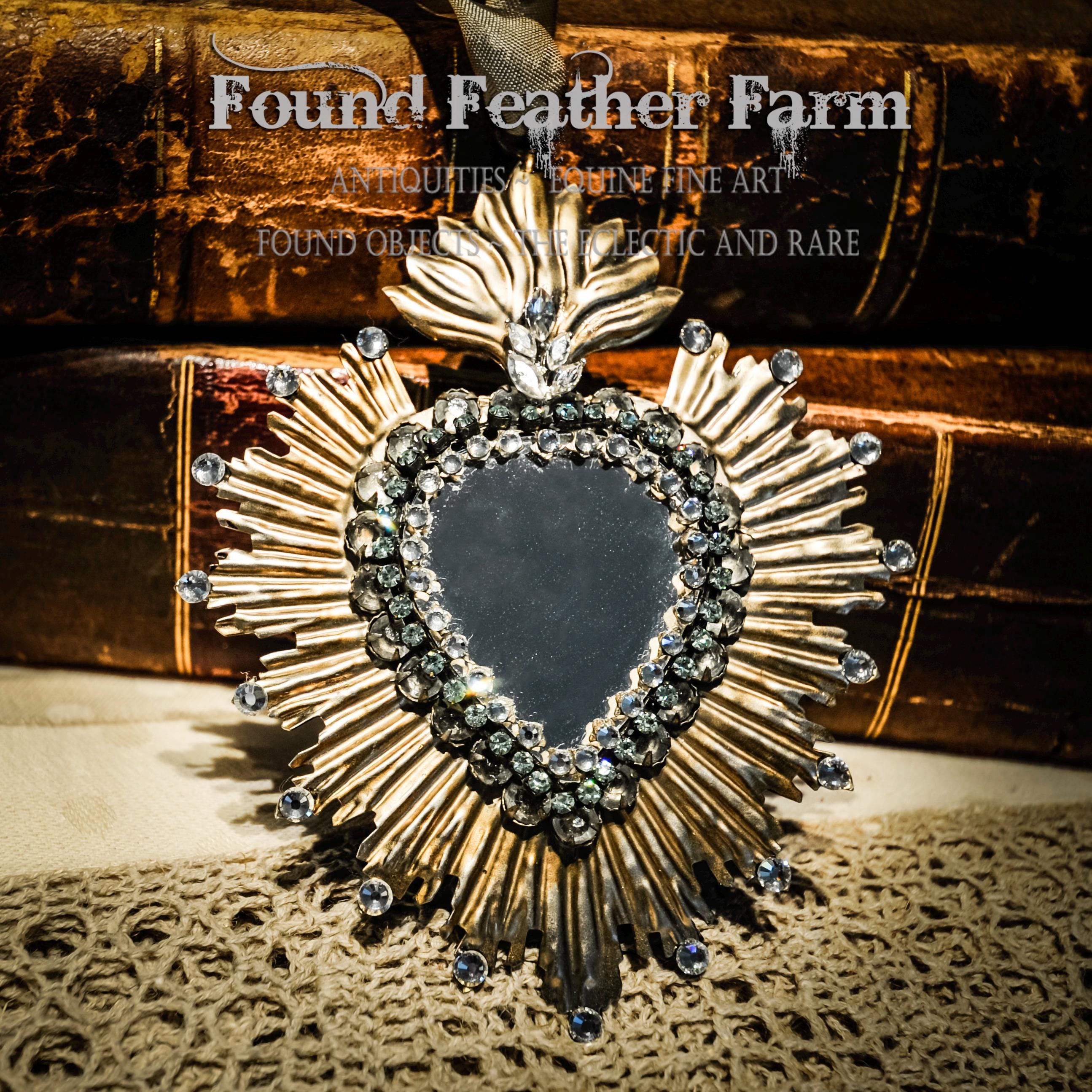 A pewter tin Jeweled Ex Voto Sacred Heart Ornament. A not often seen mirrored Heart that has been layered with sparkling rhinestone cup chains. The heart is further adorned with hand placed rhinestone jewels on it's rays. This heart sparkles and an antique medium toned taupe tea stained ribbon has been added to suspend the ornament. A great addition to a collection!