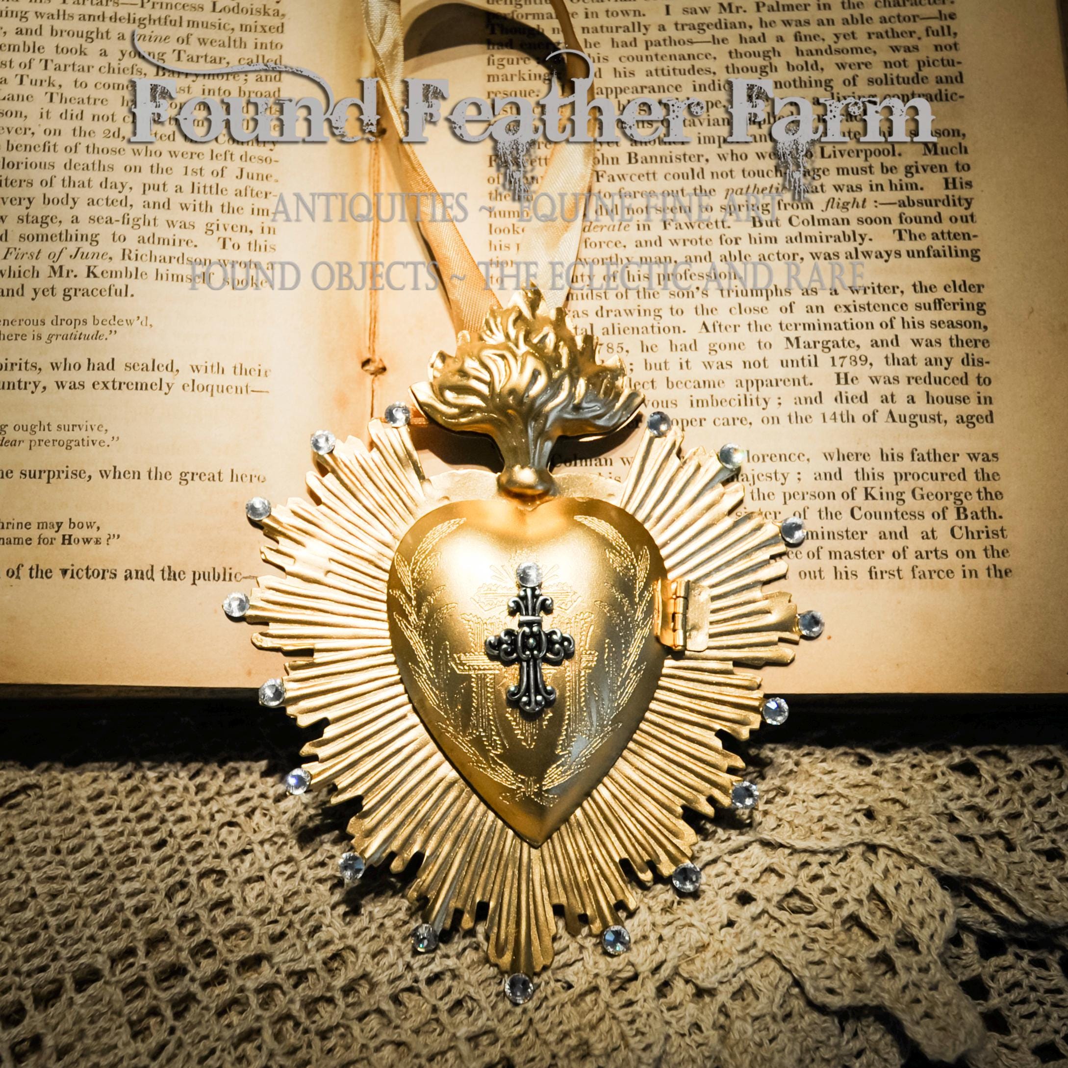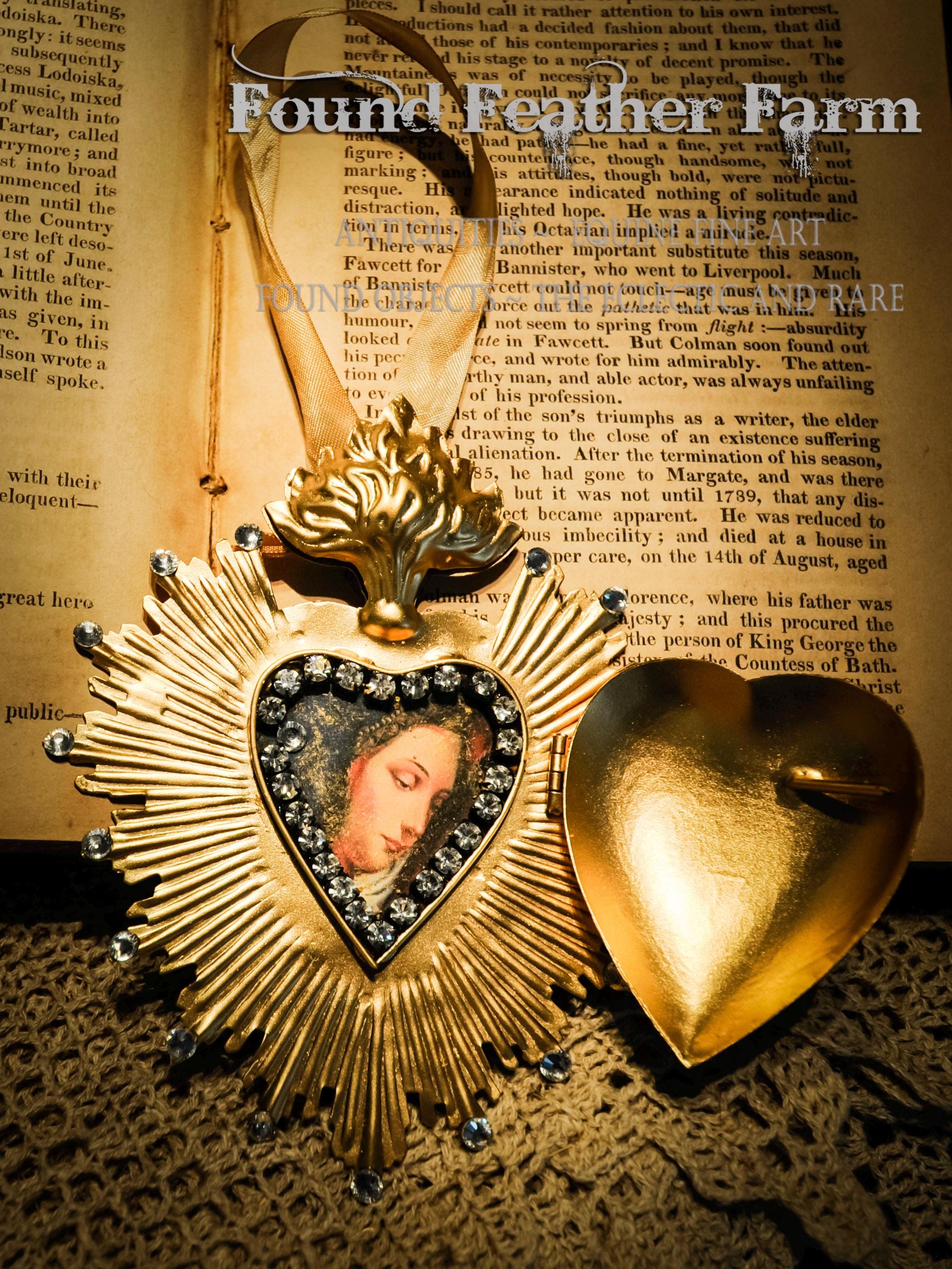 A one of a kind stunning handmade tin flaming Ex Voto heart washed in a gilded Rich bright gold leaf and embellished with sparkling glass rhinestone jewels. The medium sacred heart locket is adorned in beautiful clear rhinestones jewels and a rhinestone cup chain that adorn this gorgeous heart locket. The heart has an antique ribbon in a tea washed soft golden hue and can be hung on a wall or a tree or used to adorn a vessel or bottle. The locket opens to the image of a famous renaissance painting of the Virgin Mary.