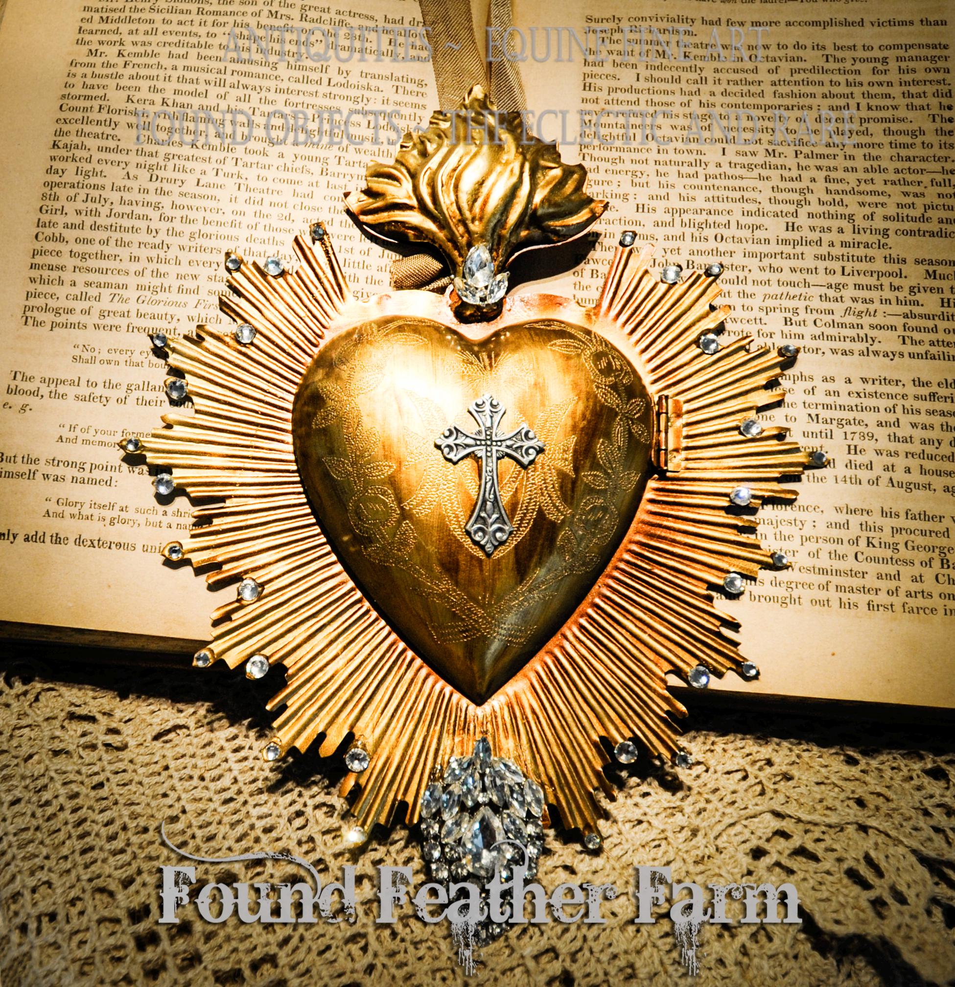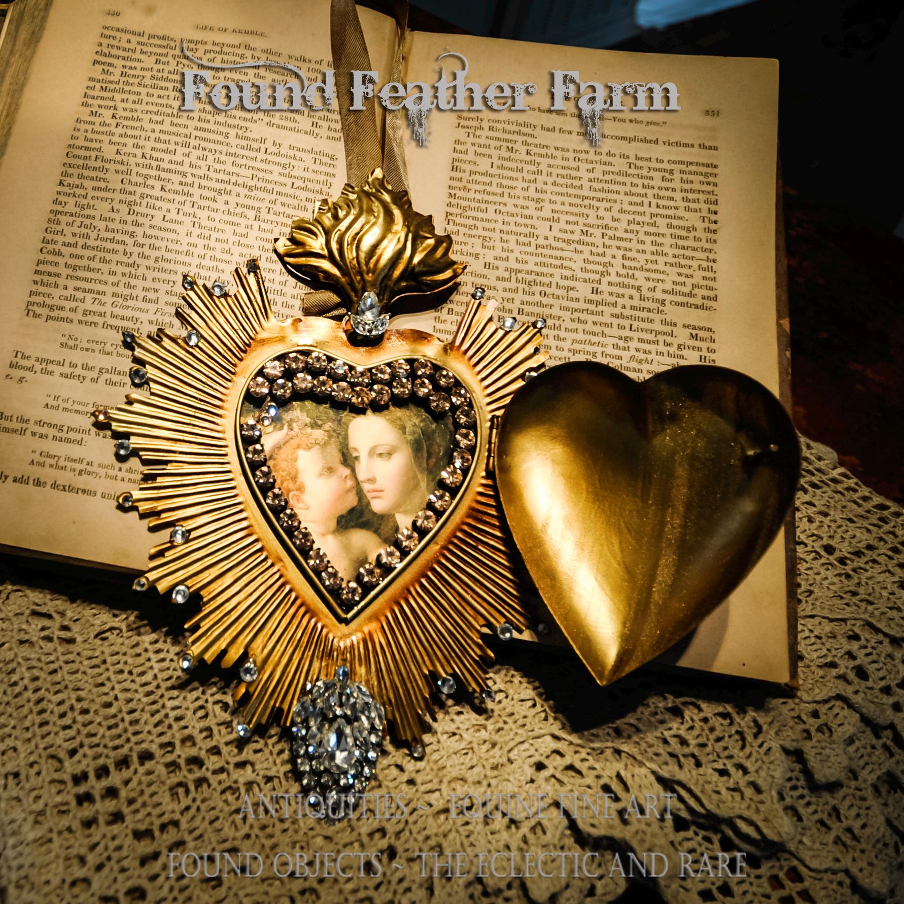 A one of a kind stunning handmade tin Ex Voto heart washed in a gilded Rich renaissance gold leaf and embellished with sparkling glass rhinestone jewels. The medium sacred heart is adorned in beautiful clear rhinestones jewels and peach rhinestone cup chains that adorn this gorgeous heart locket. The heart has an antique gold tea stained ribbon hanger and can be hung on a wall or a tree or used to adorn a vessel or bottle. The locket opens to the image of a famous renaissance painting of the Virgin Mary with the Christ Child.