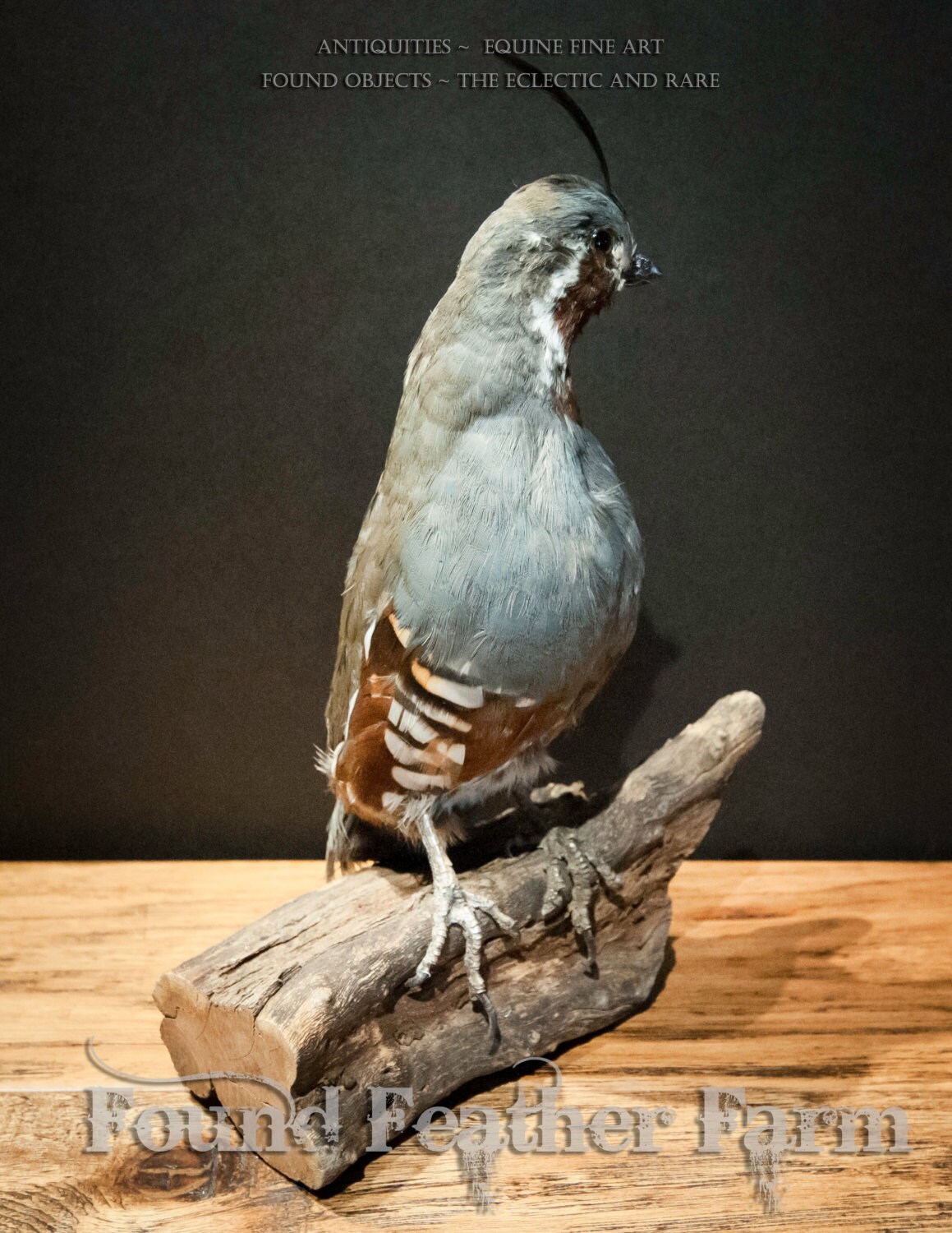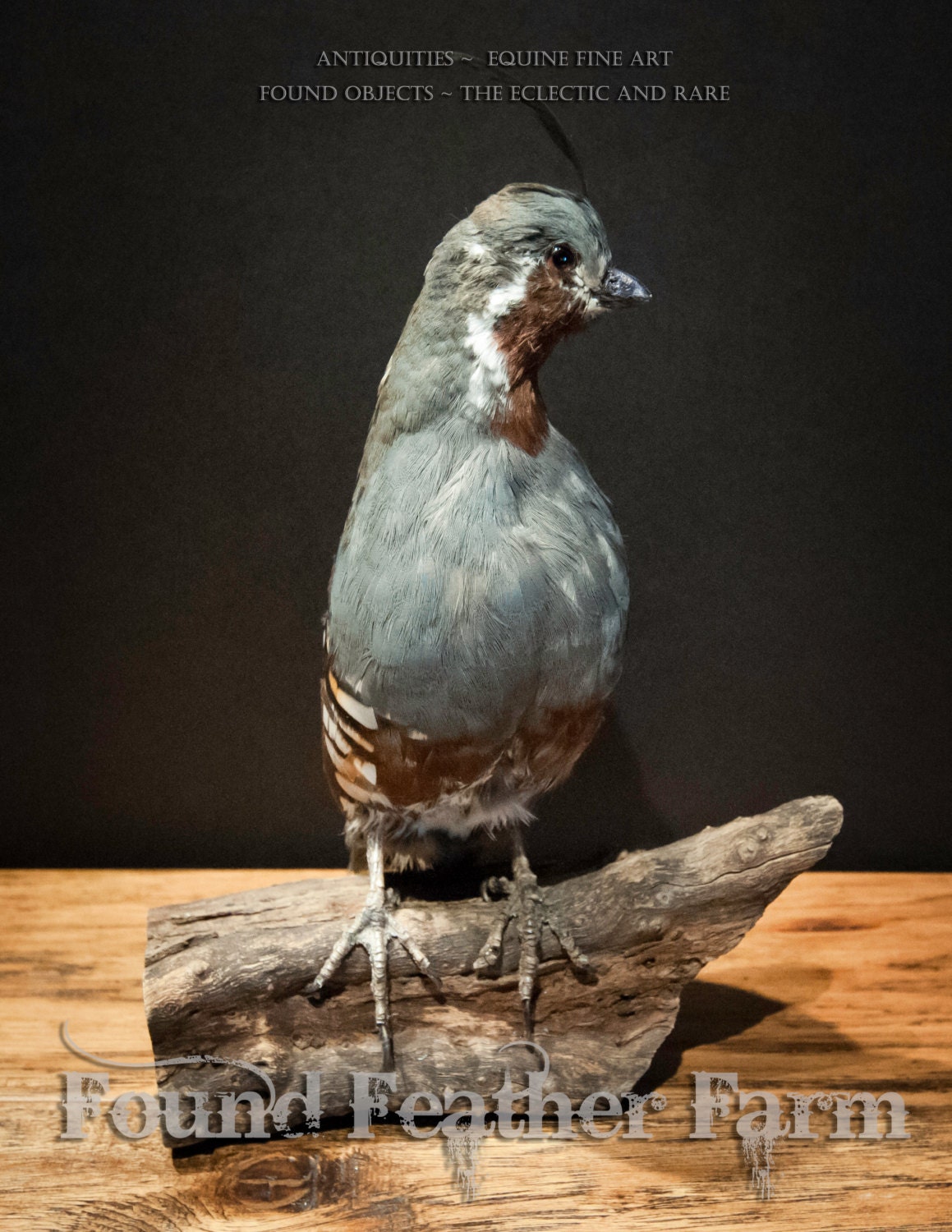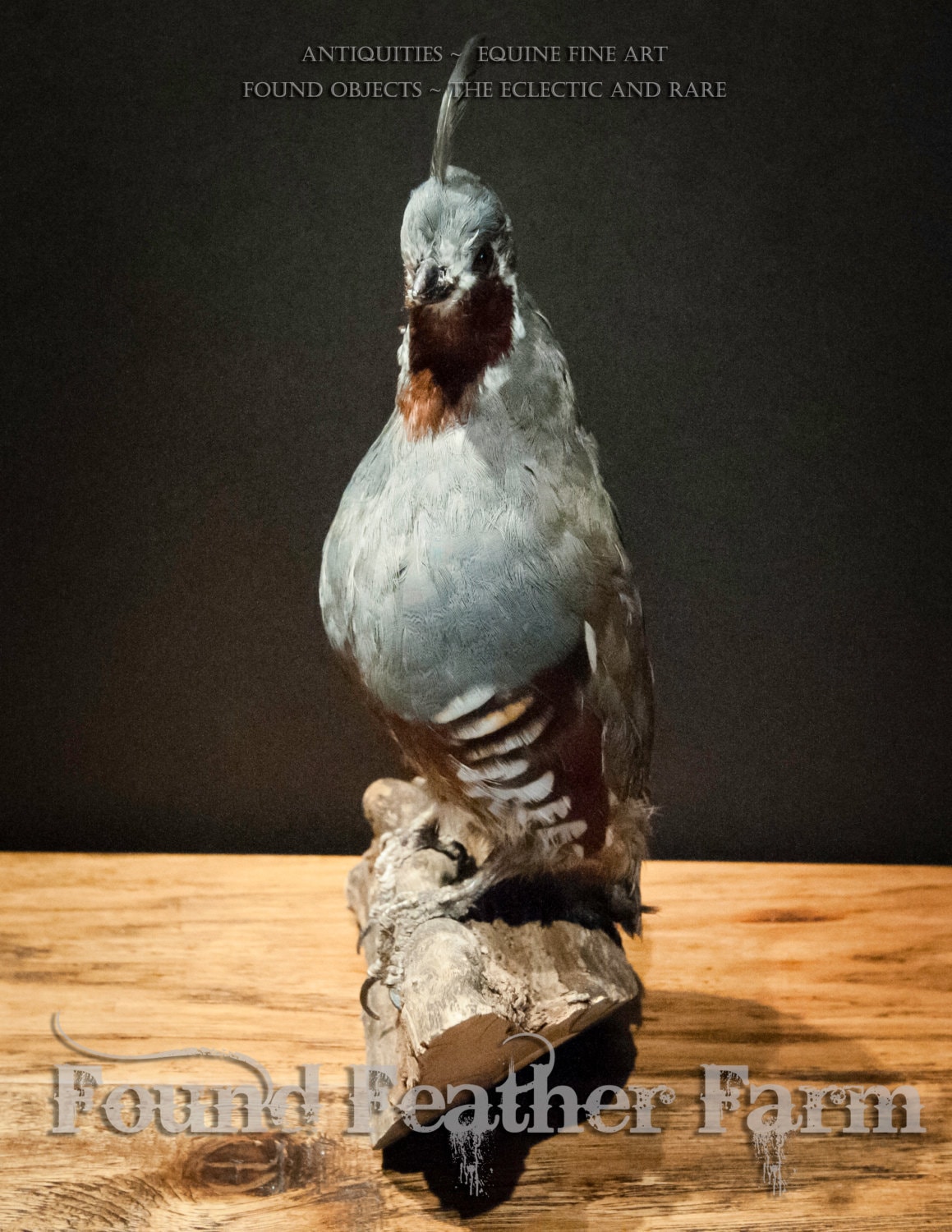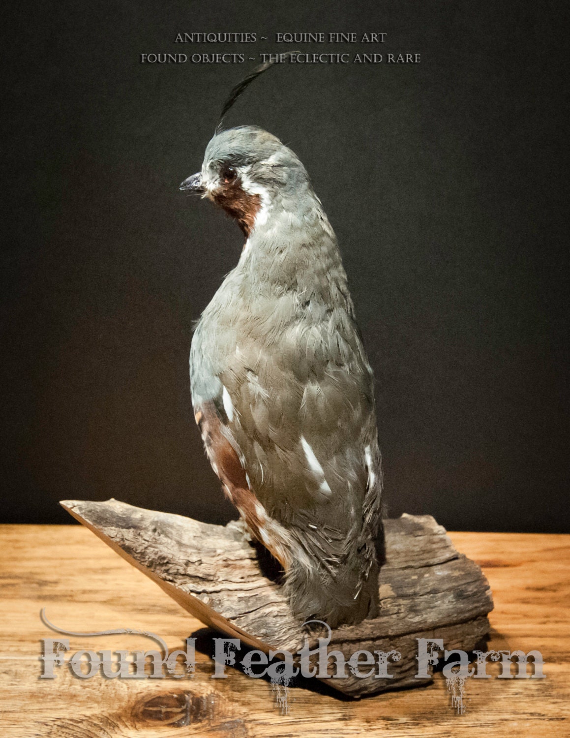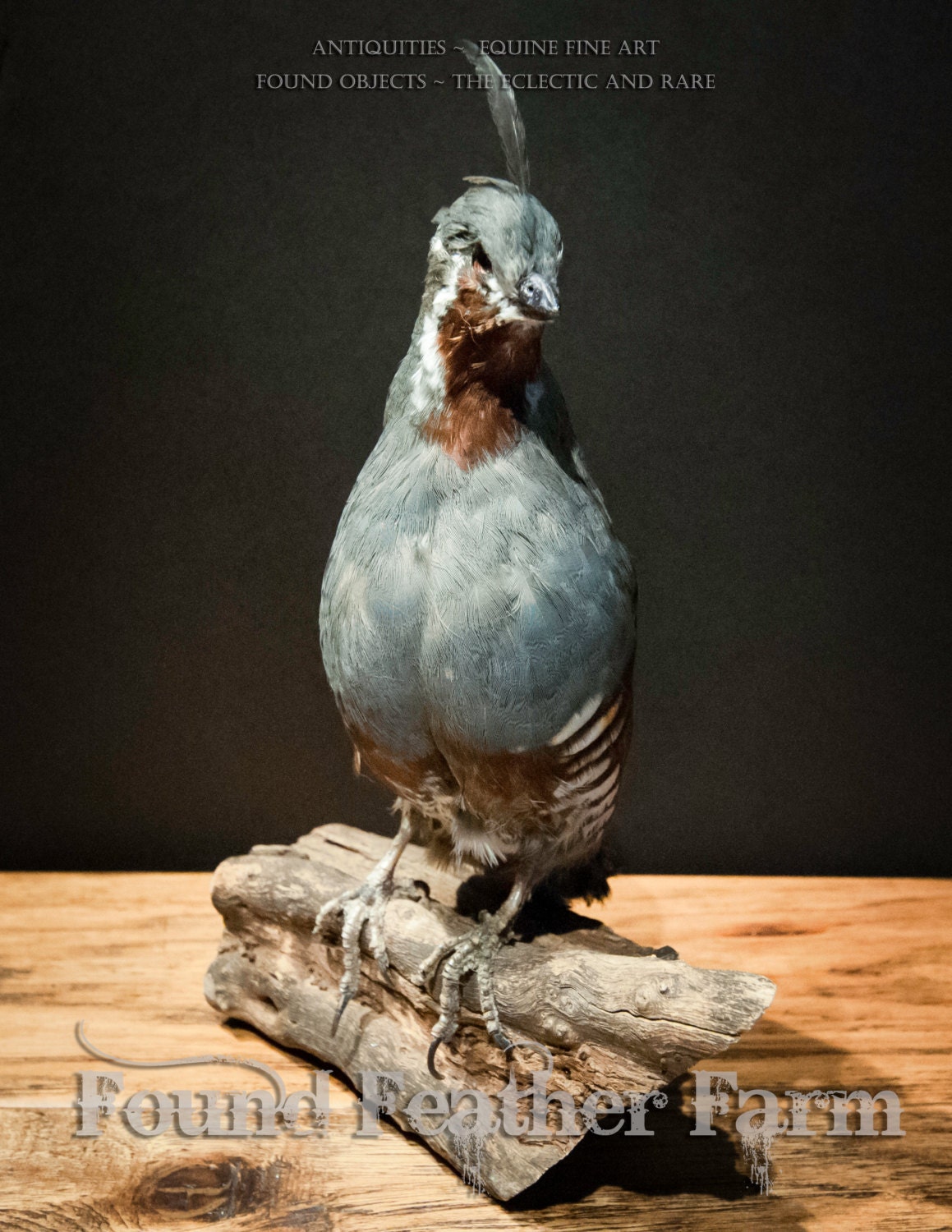 A museum quality Mountain Quail taxidermy mount. Beautiful attention has been paid to tiny details and this magnificent quail specimen has been mounted on a piece of wooden fence post. A lovely find and an exceptional mount for any interior.