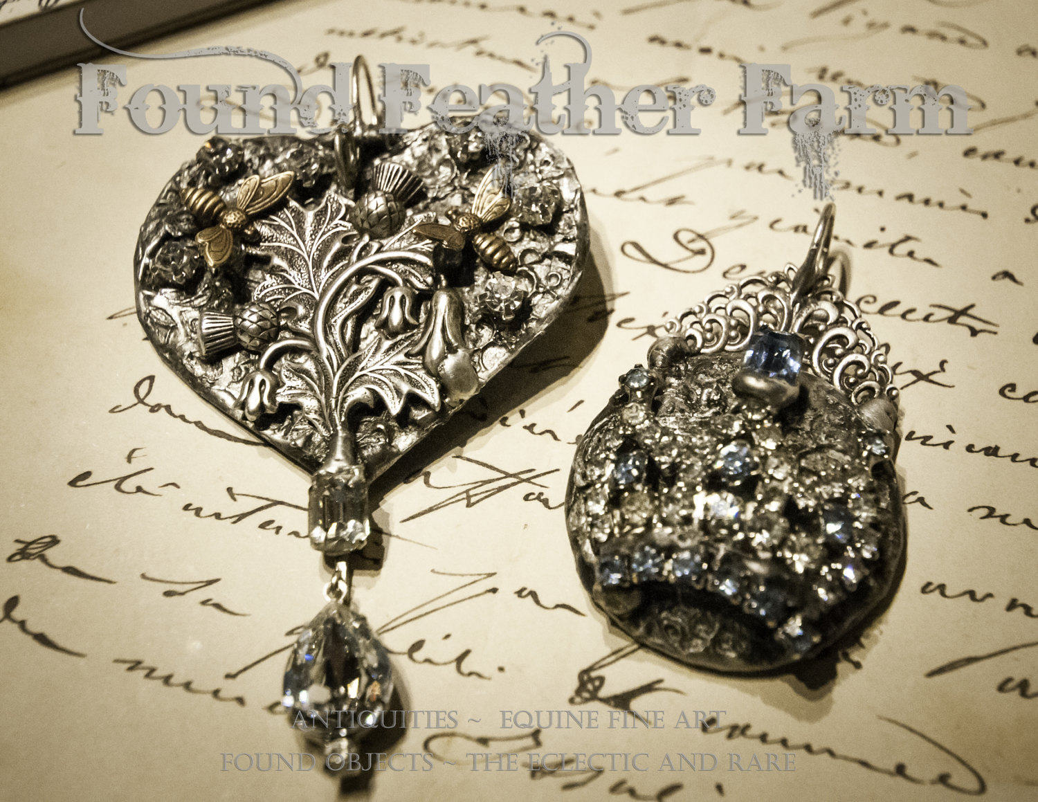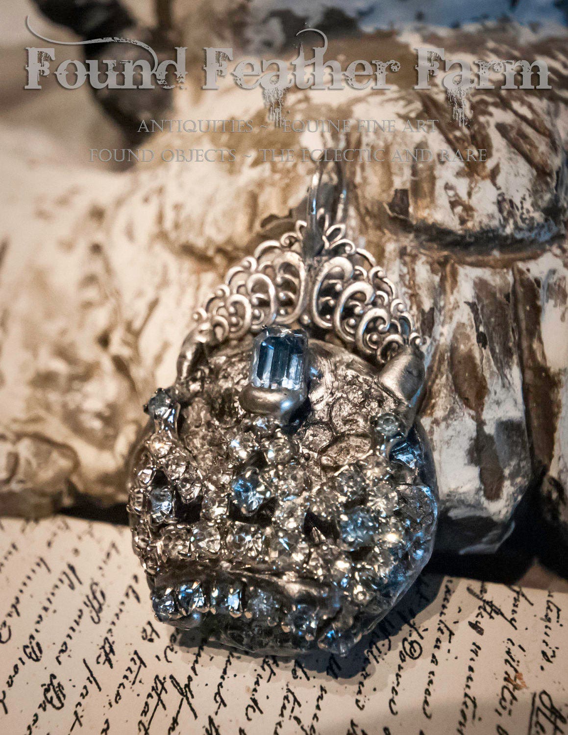 Lovely vintage crystals and soft pale blue jewels and rhinestones grace this pendant. A hand placed French silver lace finding has been added to the bail