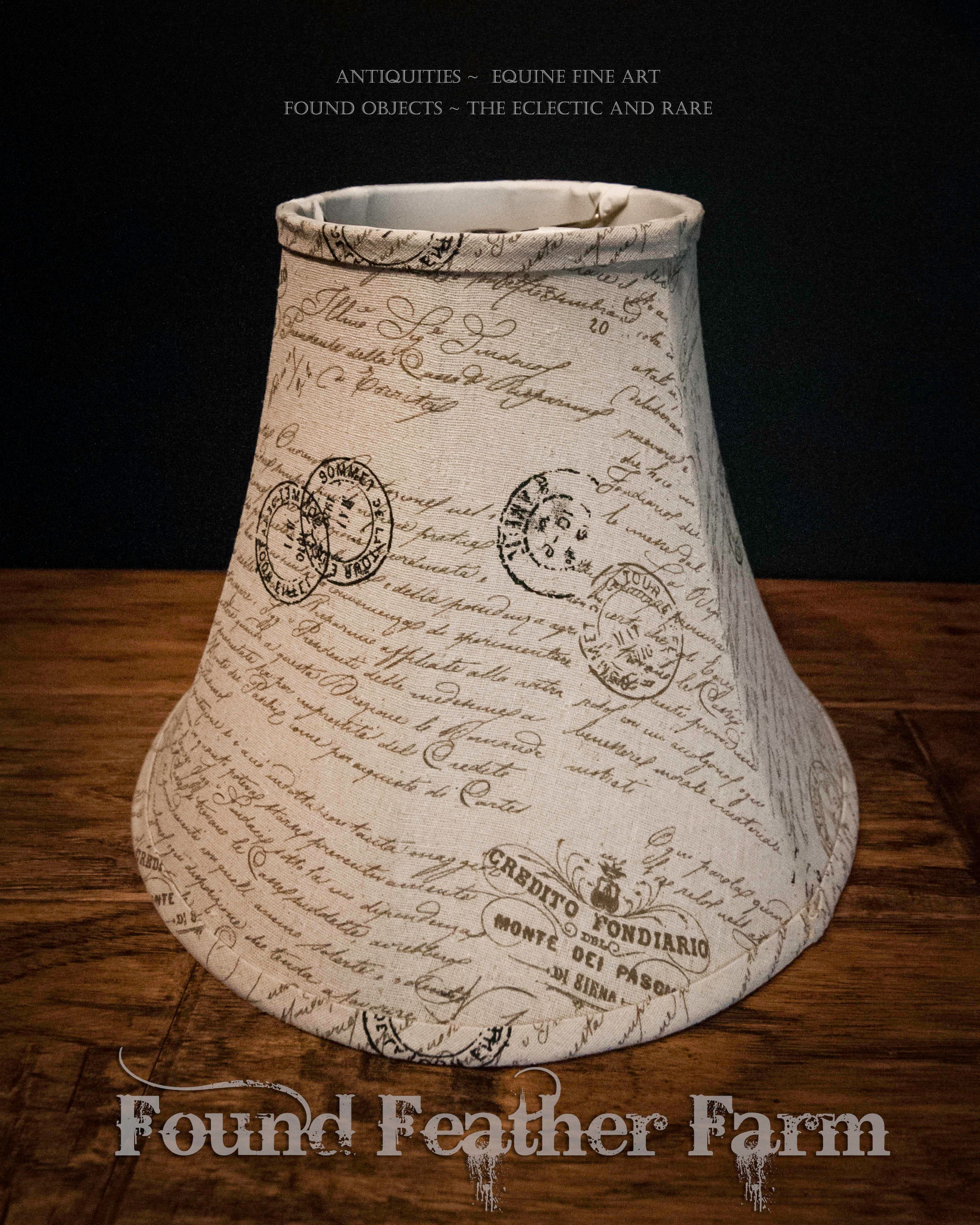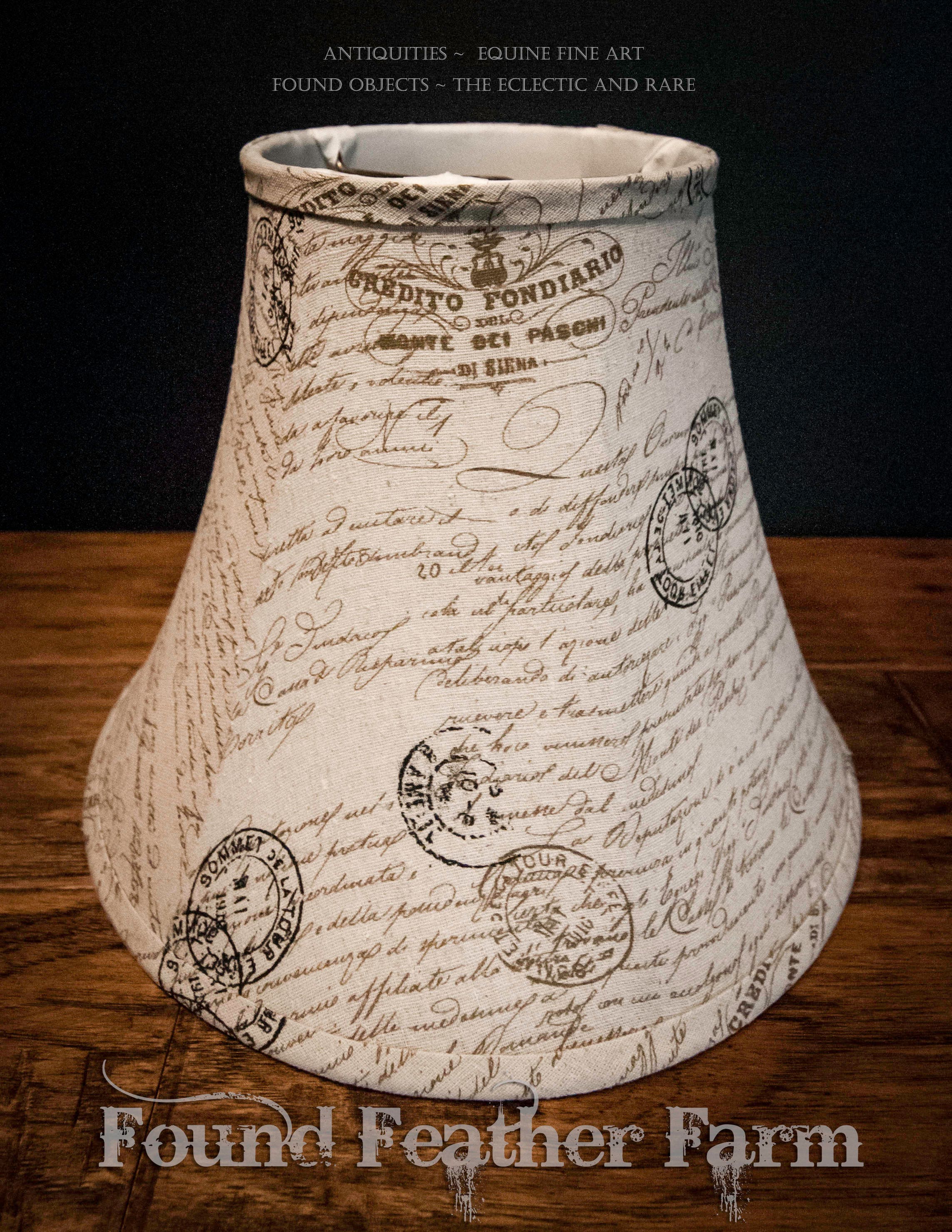 A wonderful printed linen lamp shade. The fabric has been printed with lovely French Ephemera. A great way to give an existing lamp a