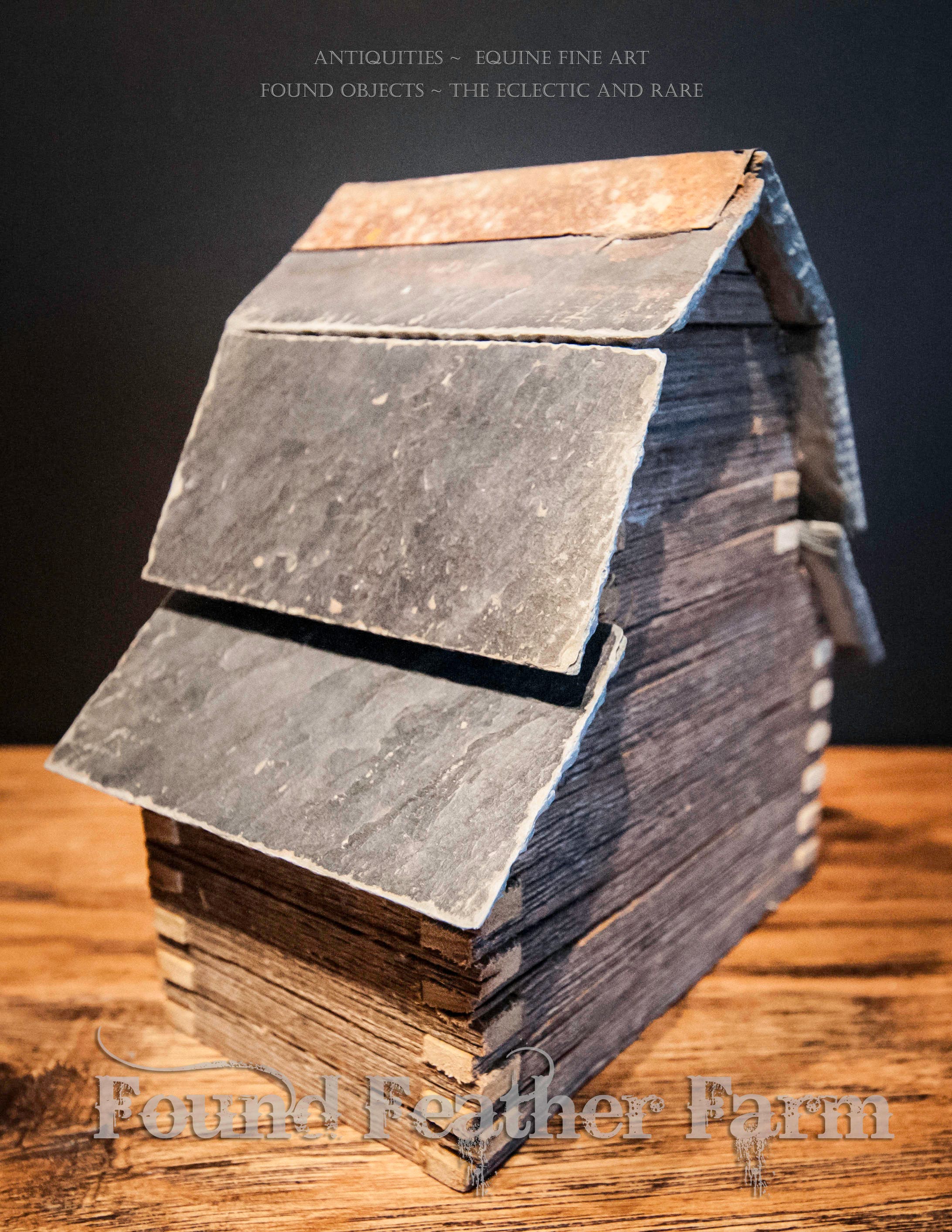 A miniature handmade primitive barn with hand hewn logs, barnwood, and topped with a slate roof. This precious barn features double barn doors.