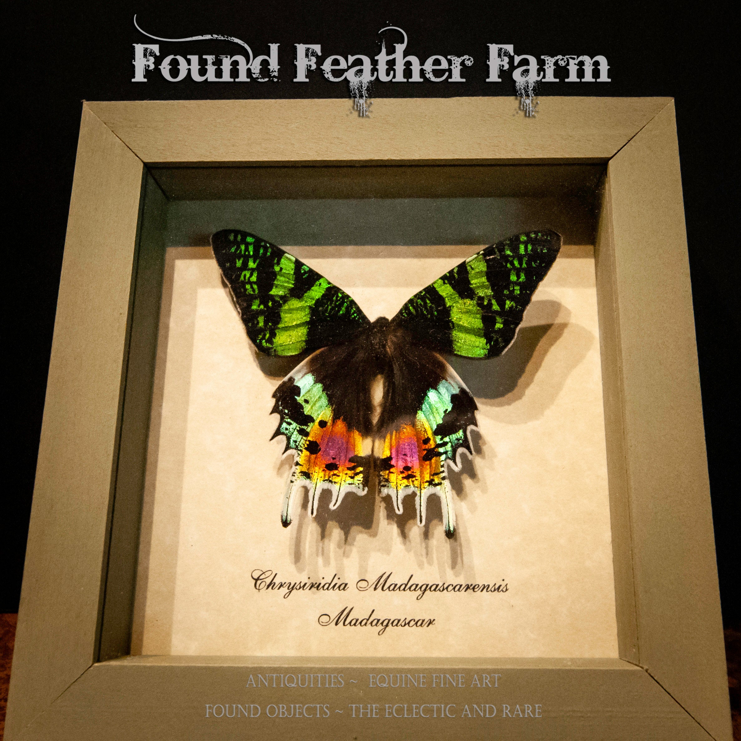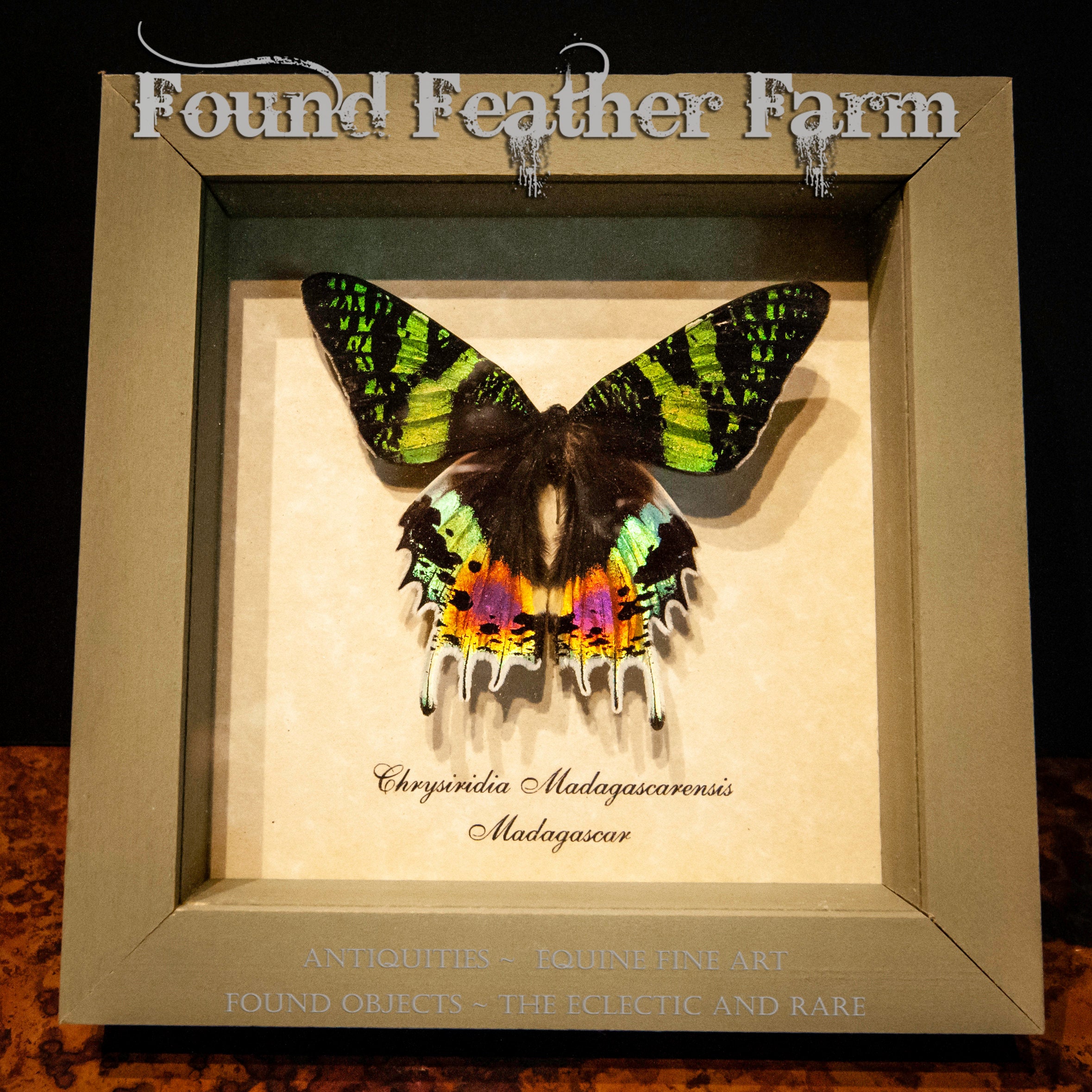 A spectacular Insect mount with a sage green shadowbox frame. This is a framed Sunset Moth Specimen from Madagascar.