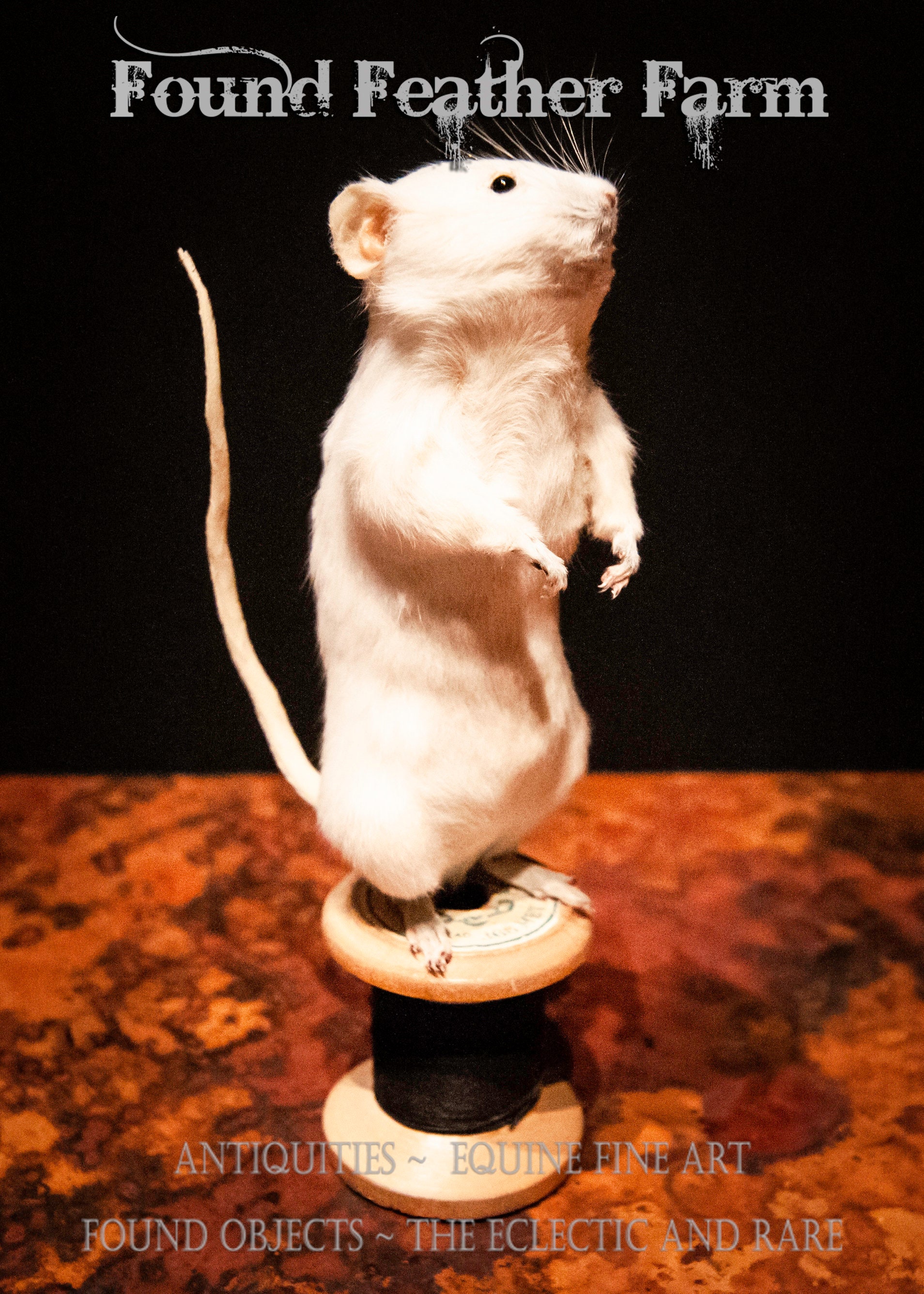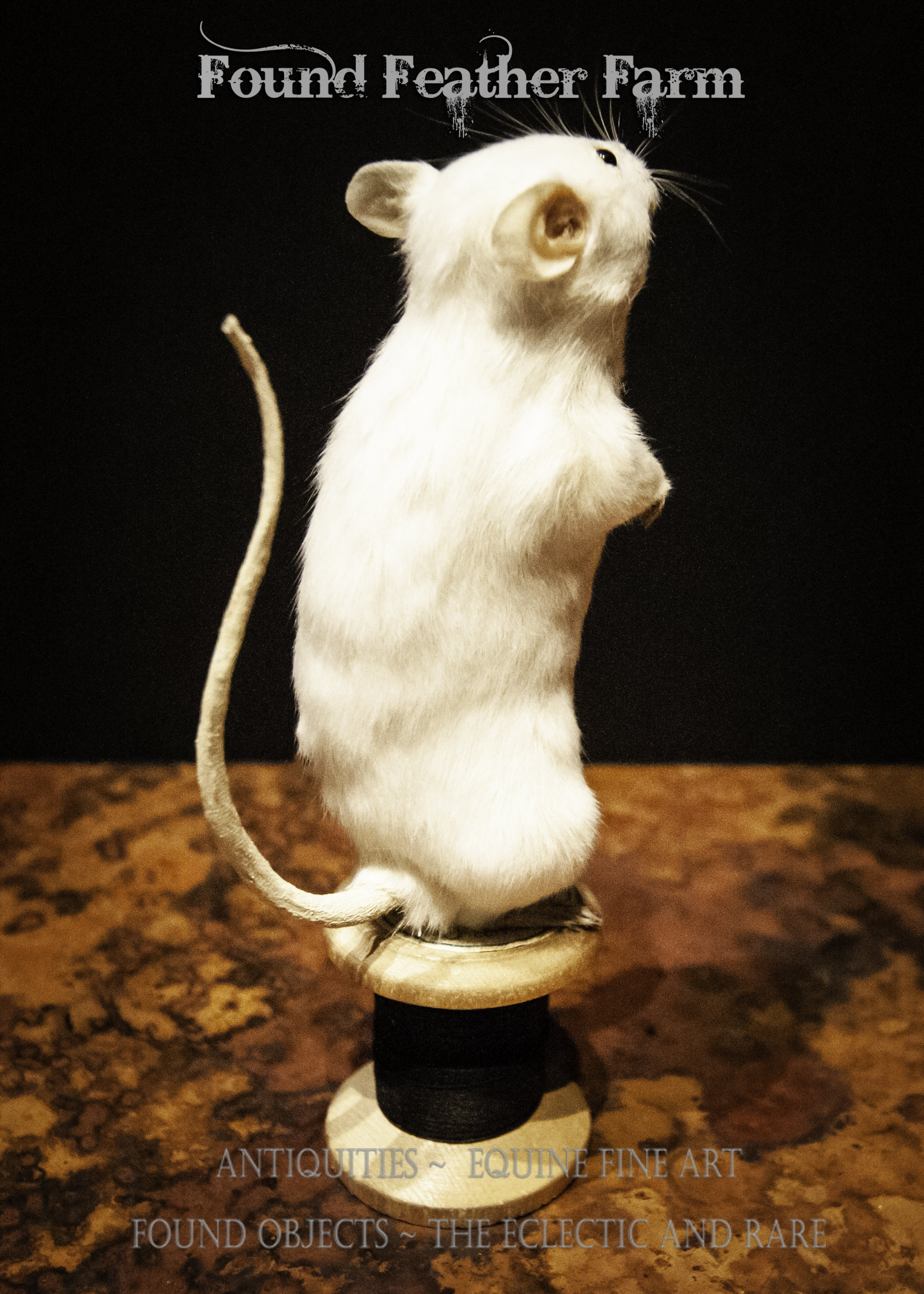 An adorable tiny white taxidermy mouse named "Munch" that has been mounted to a vintage thread spool with black thread.