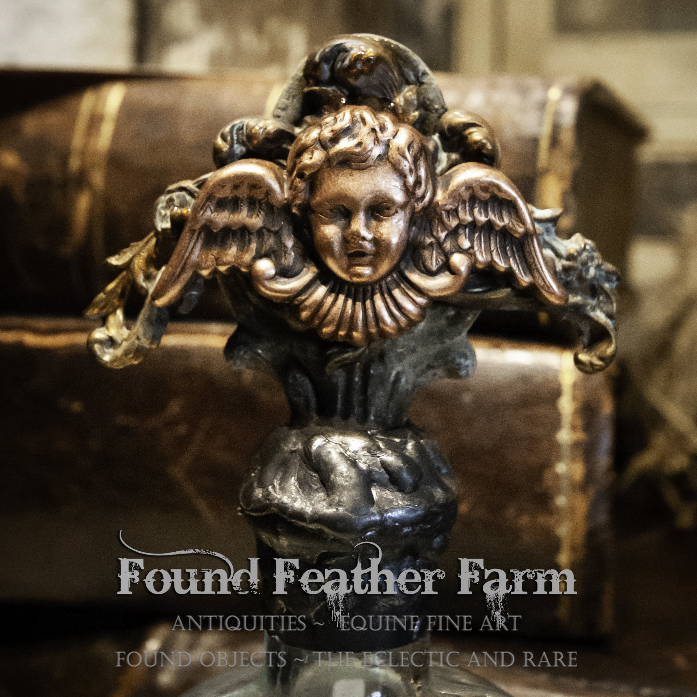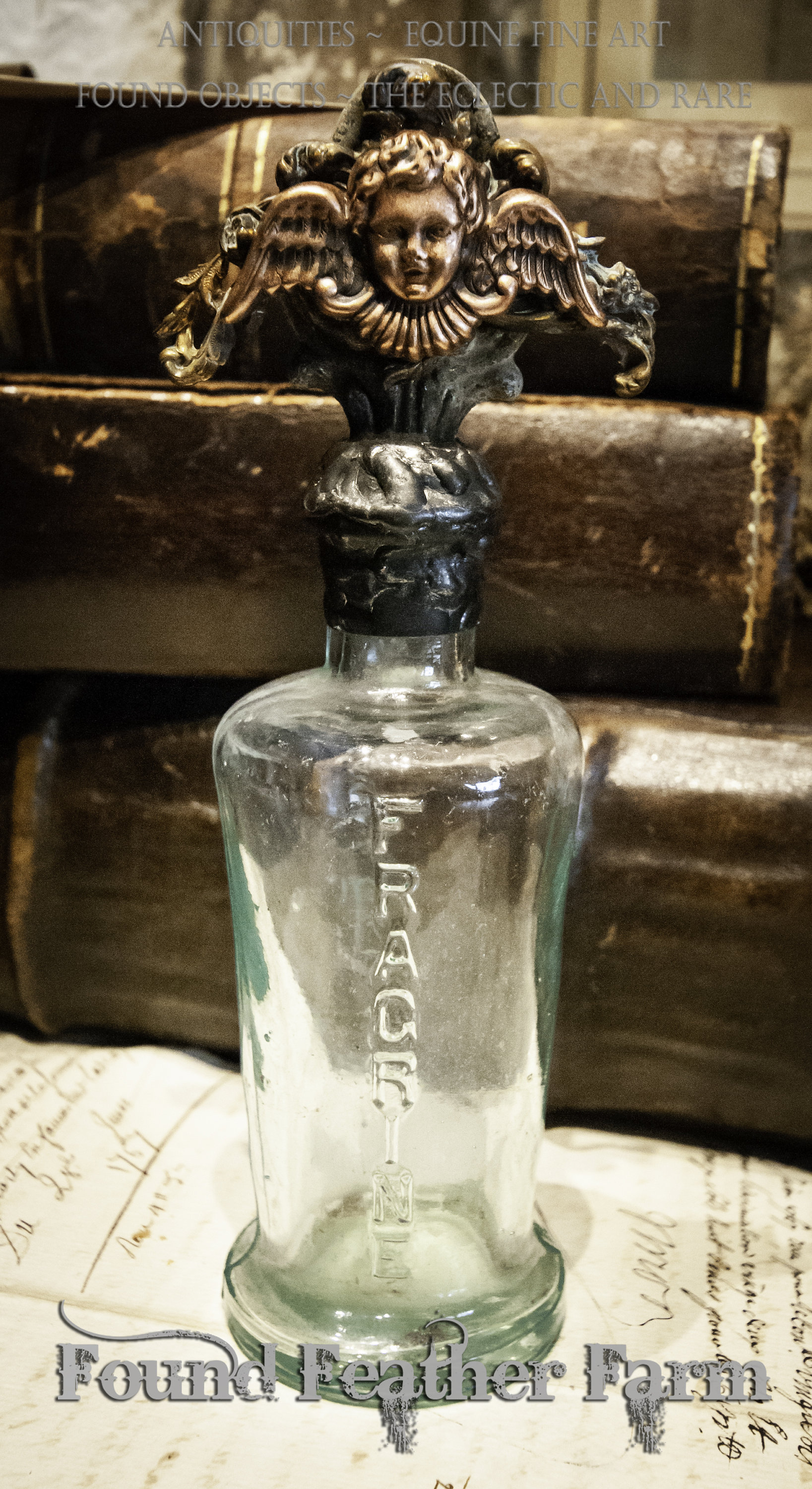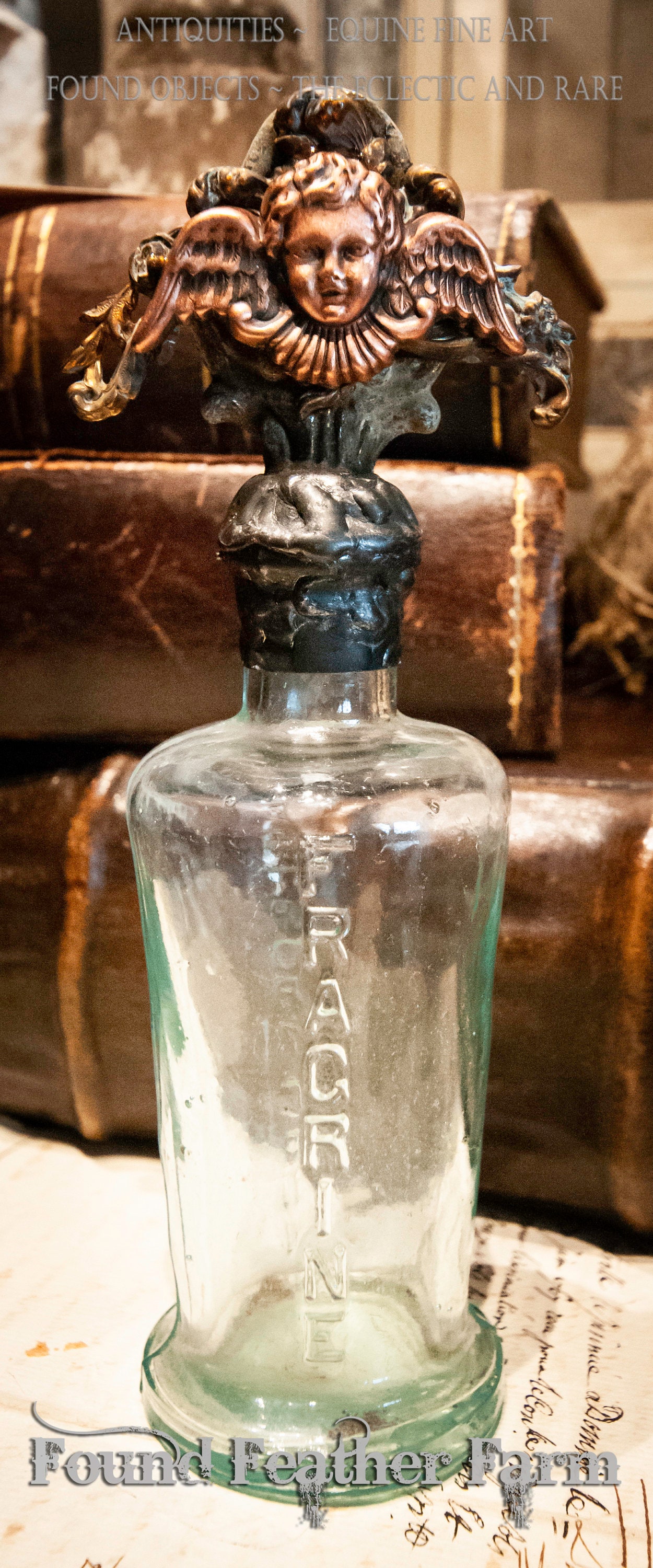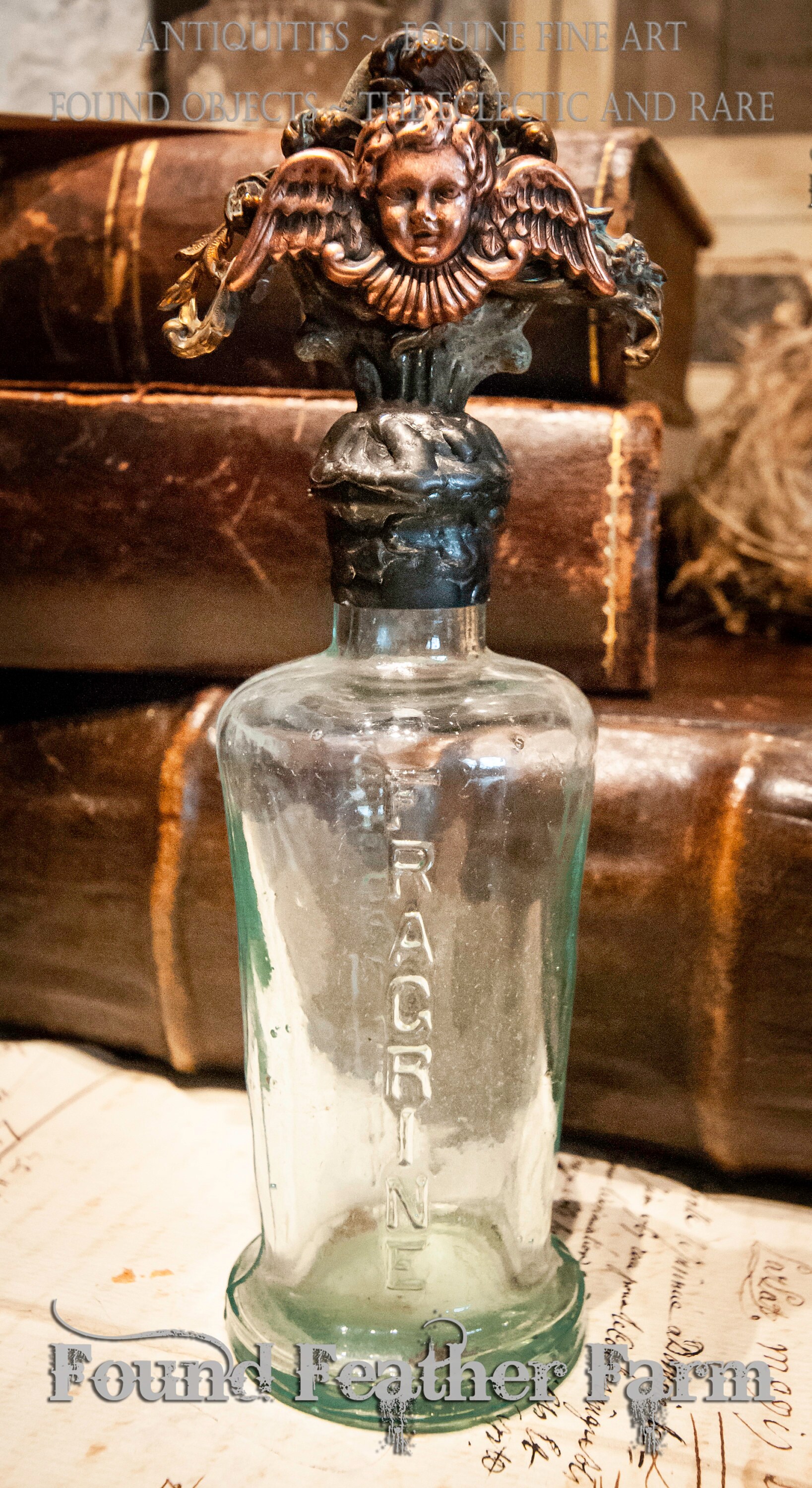 This specific one of a kind Glass Cross Bottle has over a century old glass bottle base that dates from the 1870's. This soft mint green glass antique bottle stamped with "Fragrine ~ Westport, Conn." and features a vintage gunmetal finial layered with a bronze scrolled flourish and then topped with an old world copper cherub stamping.