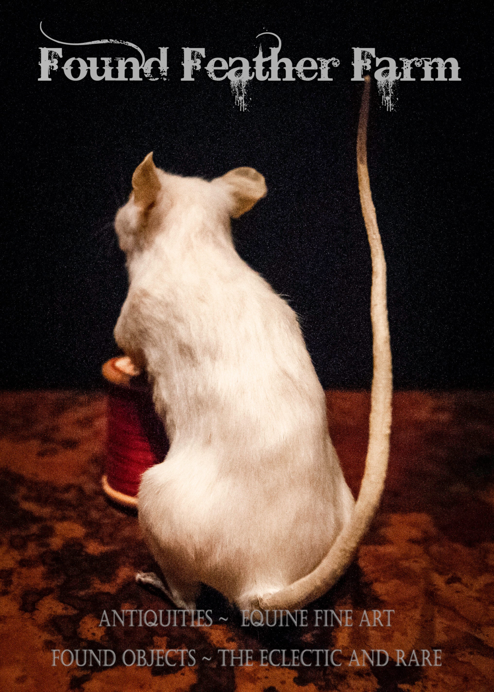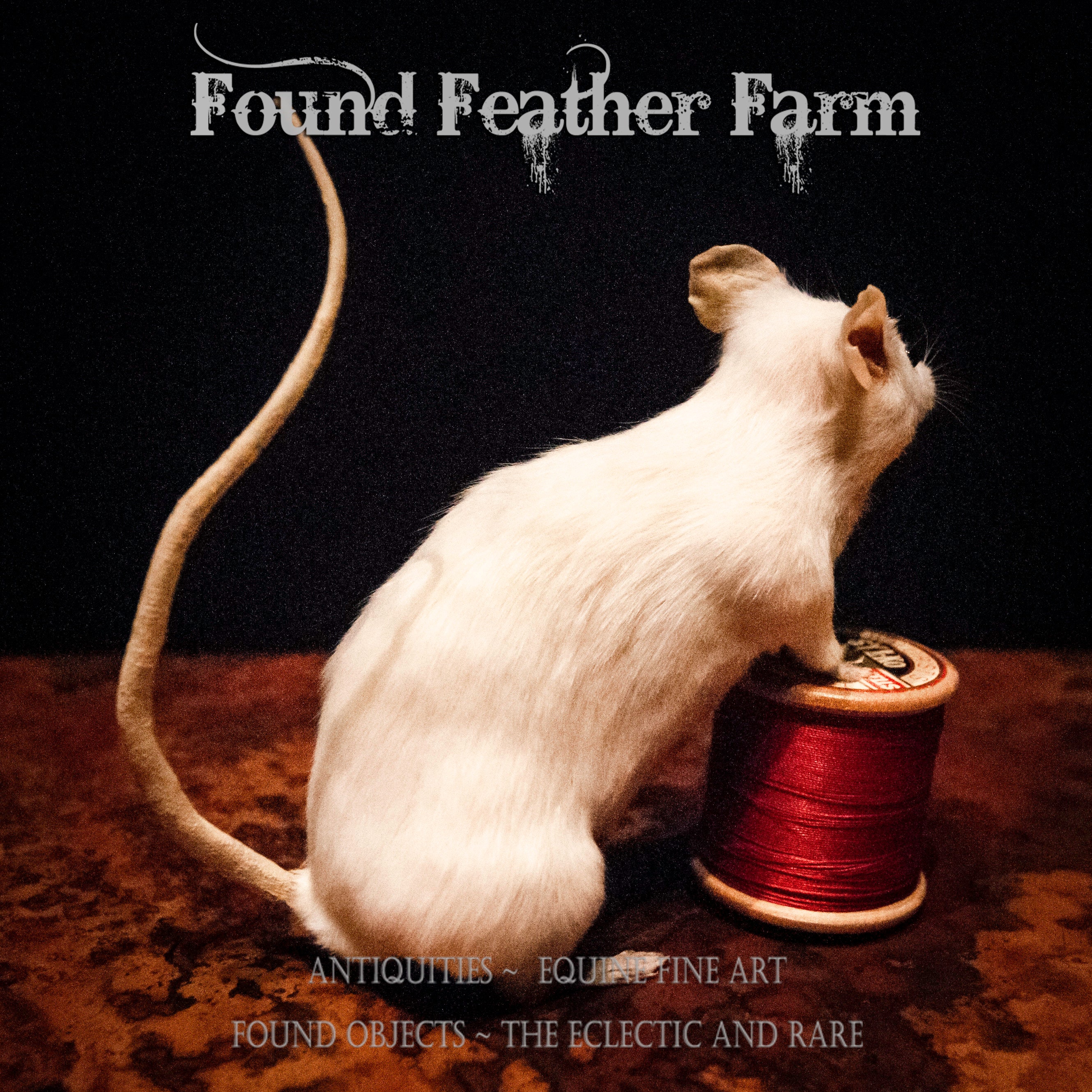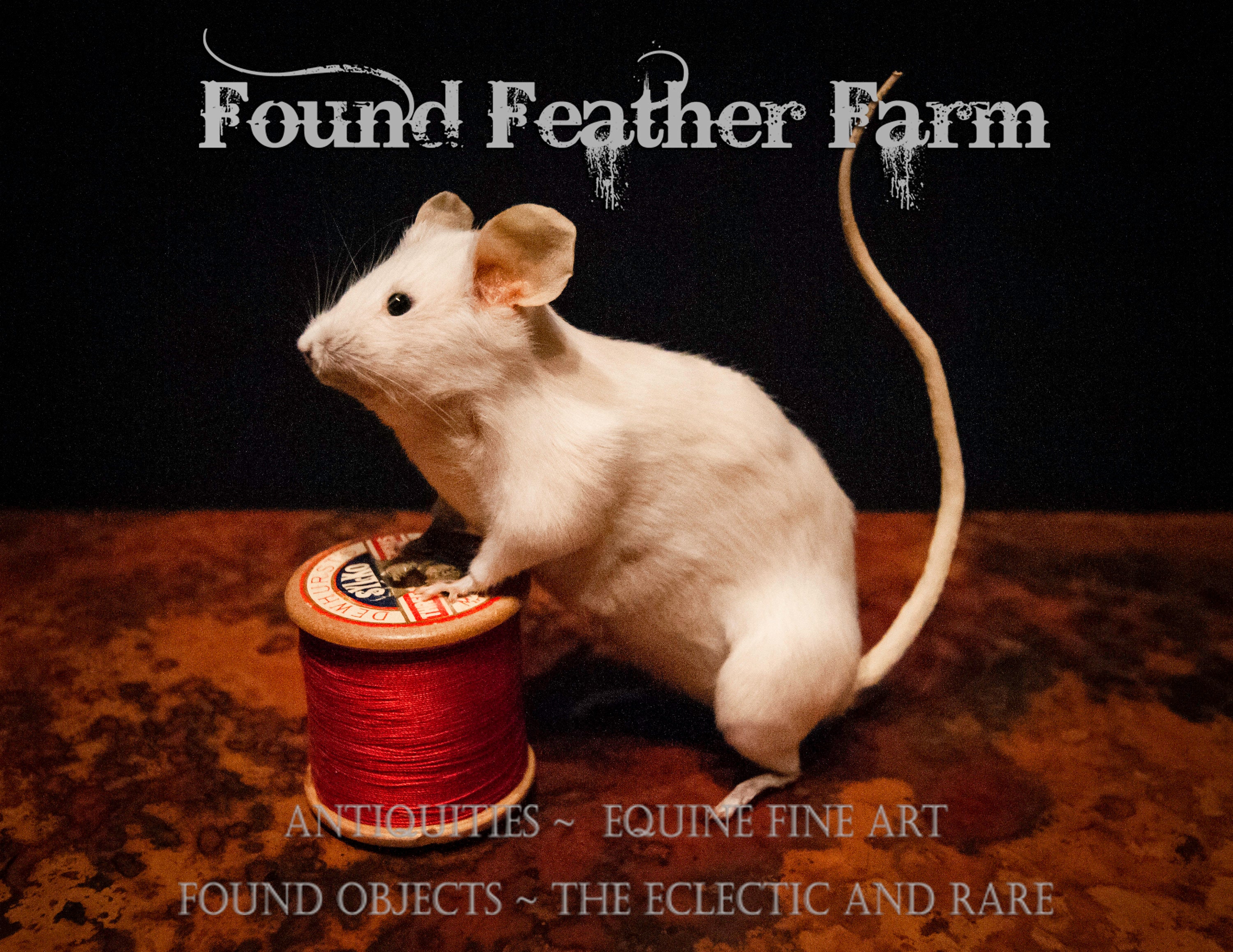 An adorable tiny white taxidermy mouse named "Nibbles" that has been mounted to a vintage thread spool with vintage red thread.